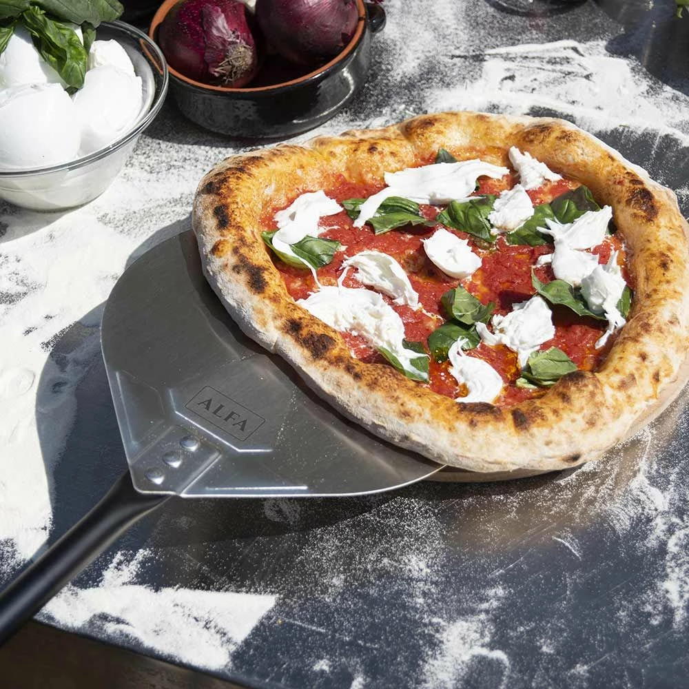 Alfa AC-5PSET36 36-Inch Medium Pizza Peel, Turner, Brush, Rake, and Shovel provides a premium accessory set for use with your Alfa oven. This pizza peel, turner, brush, rake and shovel set features aluminum and stainless steel construction for superior durability, while adjustable length tubular handles make it easier to work near hot ovens. The brush head features brass bristles to effectively clean the oven floor without damaging the oven, while the included rake makes it easy to move burning wood to keep fires burning evenly. The shovel allows for easy removal of spent embers and ash for more efficient cleanup. Professional non-slip handles provide excellent grip, while the functional design of these tools makes baking more convenient every time you use your oven. These tools are available in either red or black finishes.