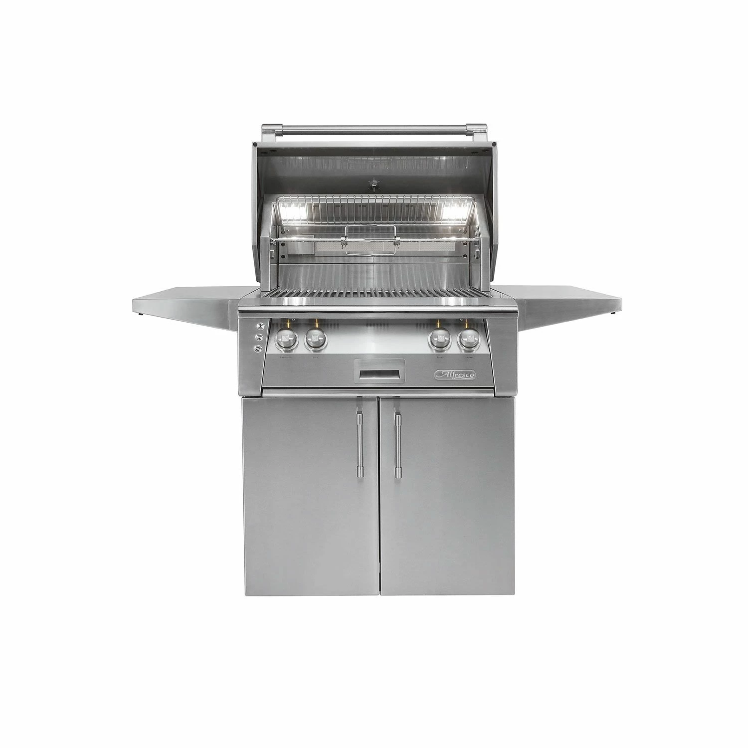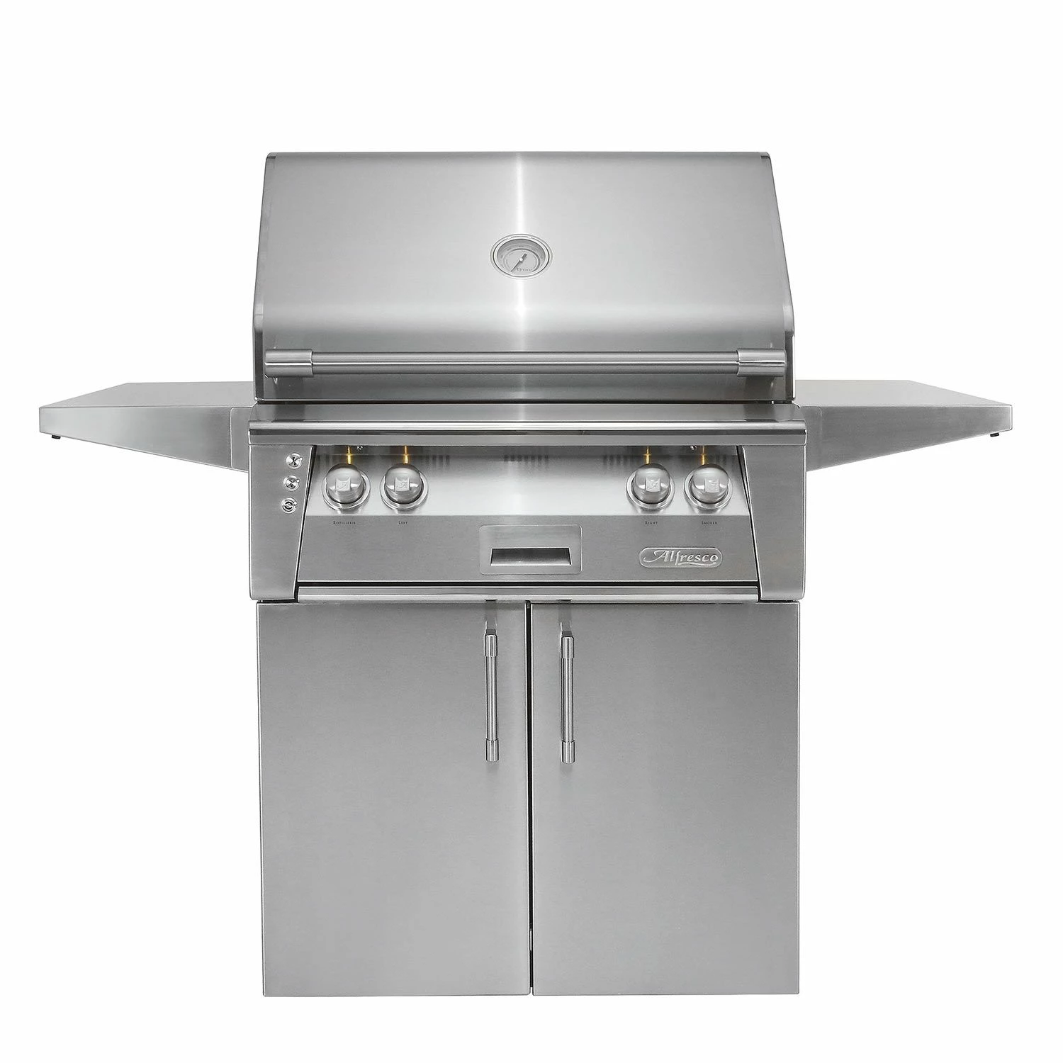 Alfresco ALXE-30C Freestanding Grill, 30-Inch provides a high performance luxury grill that is a terrific option to complete your outdoor kitchen. The 304 stainless steel grill features (2) 18-SR stainless steel main burners producing 55,000 BTUs with 542 square inches of grilling area with the option to upgrade to a Sear Zone infrared burner or a dual side burner. The Sear Zone features a “V-shaped” design and reaches temperatures up to 1500°F to produce professional steakhouse results using up to 50% less fuel. Above the burners, the pyramid-shaped ceramic briquettes eliminate hot and cold spots to maximize flavor as they evenly deliver heat to the cooking surface. The premium cooking grates have a special nonstick electro-polished finish, to achieve professional grill marks every time. The heavy-duty stainless steel cart allows for additional storage with a choice between double doors or the deluxe door and drawer combo.