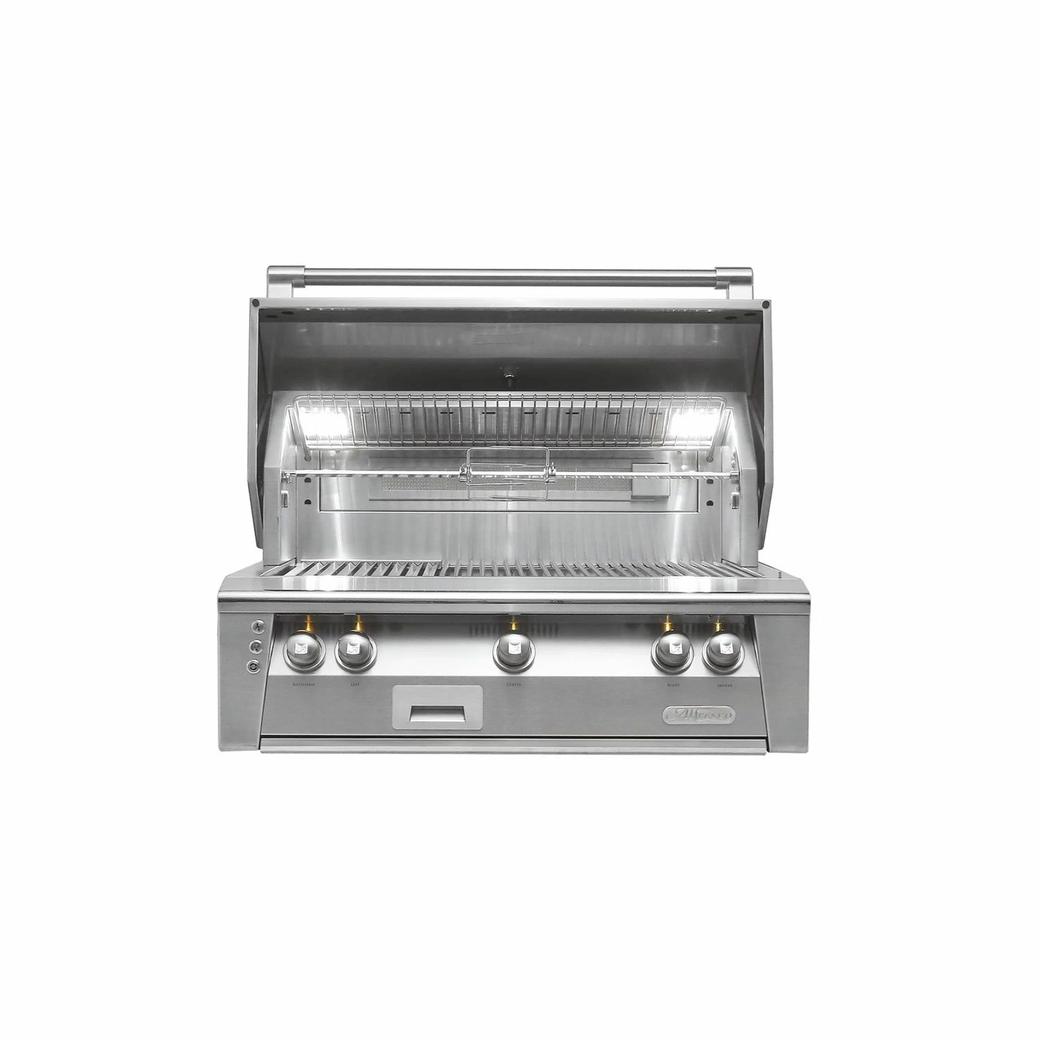 Alfresco ALXE-36 Built-In Grill, 36-Inch provides a high performance luxury grill that is a terrific option to complete your outdoor kitchen. The 304 stainless steel grill features (3) 18-SR stainless steel main burners producing 82,500 BTUs with 660 square inches of grilling area with the option to upgrade to a Sear Zone infrared burner. The Sear Zone features a “V-shaped” design and reaches temperatures up to 1500°F to produce professional steakhouse results – all while using up to 50% less fuel. Above the burners, the pyramid-shaped ceramic briquettes eliminate hot and cold spots to maximize flavor as they evenly deliver heat to the cooking surface. The premium cooking grates have a special nonstick electro-polished finish, to achieve professional grill marks every time.