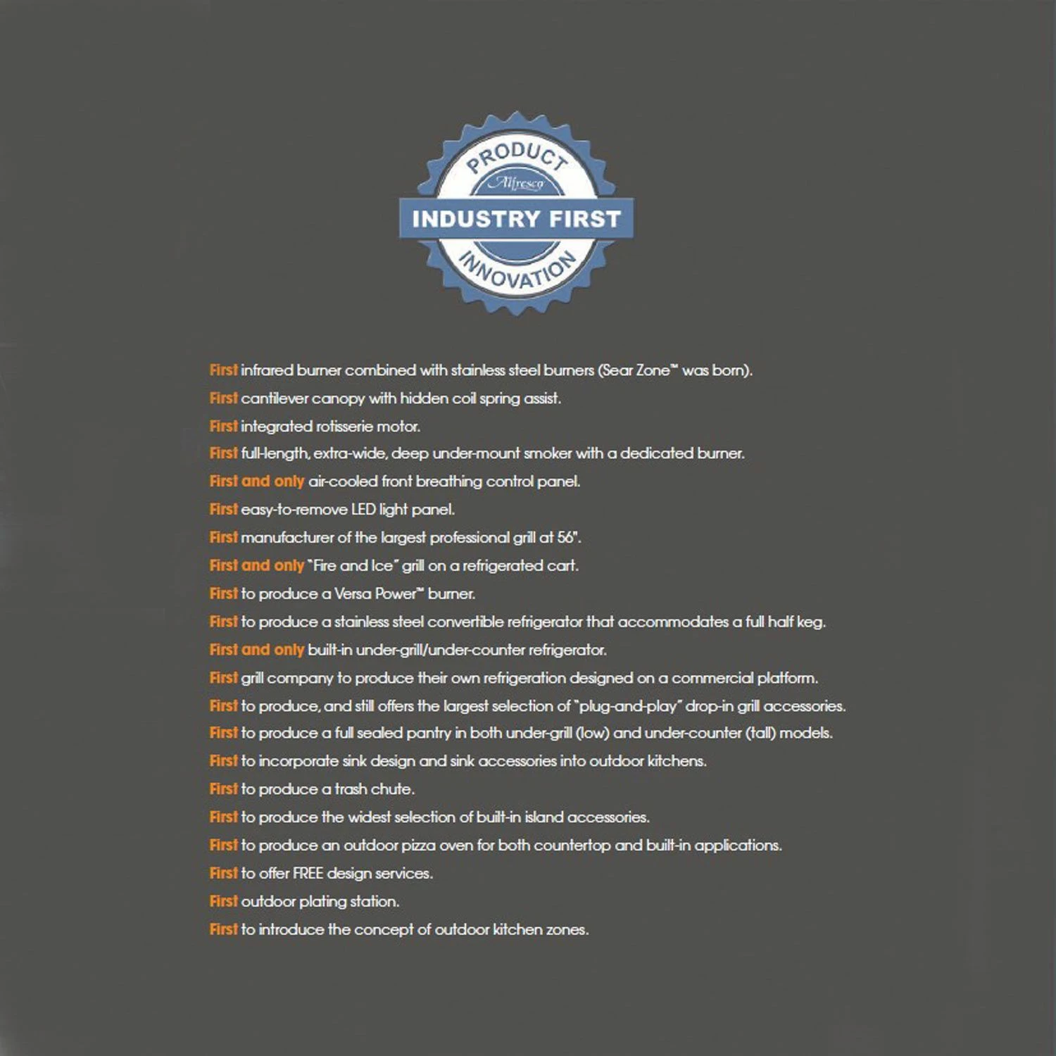 Additionally, this grill features an adjustable 3-position warming rack, SafeTouch technology to keep control components and electronics cool to the touch, hood-assist for easy lifting, simple push-button ignition with sealed 110v AC power source, dual halogen work lights, rich amber LED knob lighting, includes a matching grill cover. When using Alfresco’s drop-in accessories, the Grill Accessory Grate (XE-36AG) is recommended as it creates maximum grilling surface for your 36-inch grill (Sold Separately).