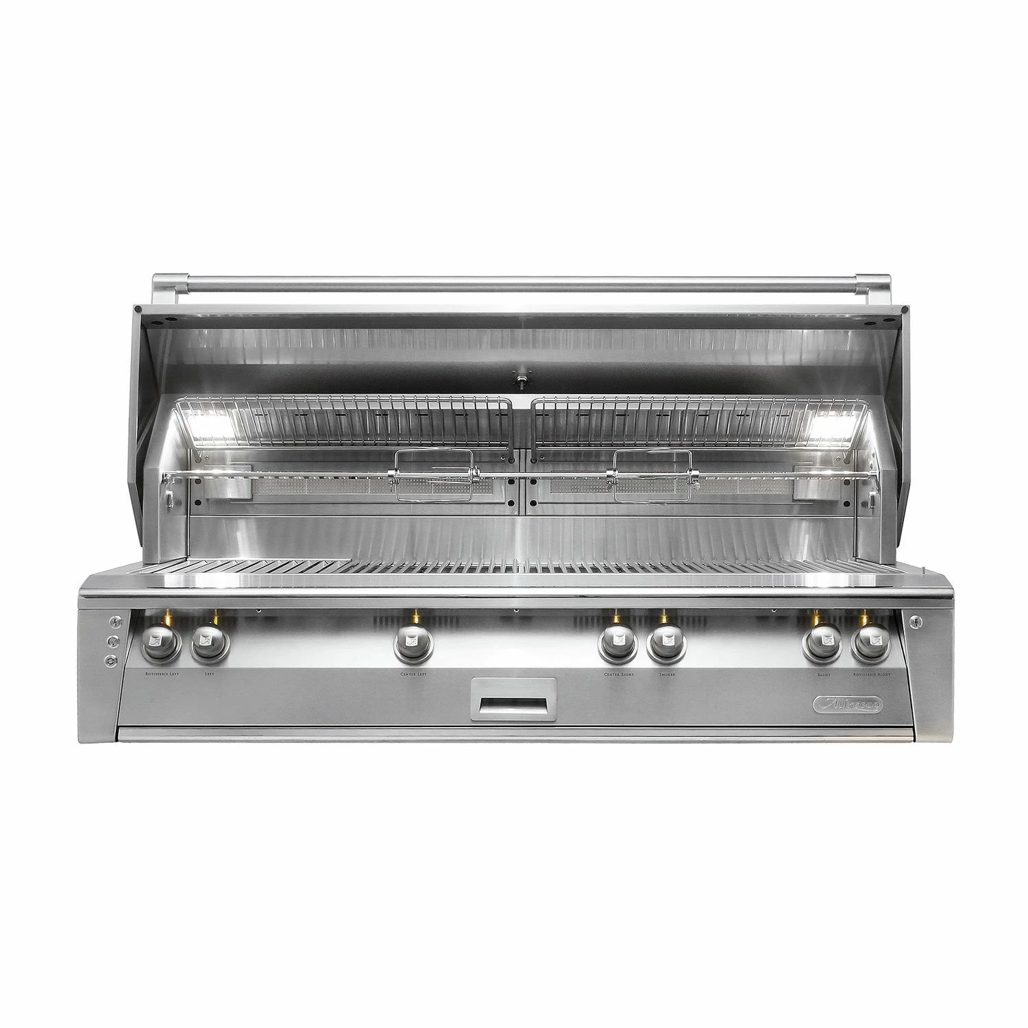 Alfresco ALXE-56BFG Built-In Grill, 56-Inch provides a high performance luxury grill that is a terrific option to complete your outdoor kitchen. The 304 stainless steel grill features (3) 18-SR stainless steel main burners producing 82,500 BTUs and a Sear Zone infrared burner producing 27,500 BTUs with 998 square inches of grilling area. The Sear Zone features a “V-shaped” design and reaches temperatures up to 1500°F to produce professional steakhouse results – all while using up to 50% less fuel. Above the burners, the pyramid-shaped ceramic briquettes eliminate hot and cold spots to maximize flavor as they evenly deliver heat to the cooking surface. The premium cooking grates have a special nonstick electro-polished finish, to achieve professional grill marks every time.