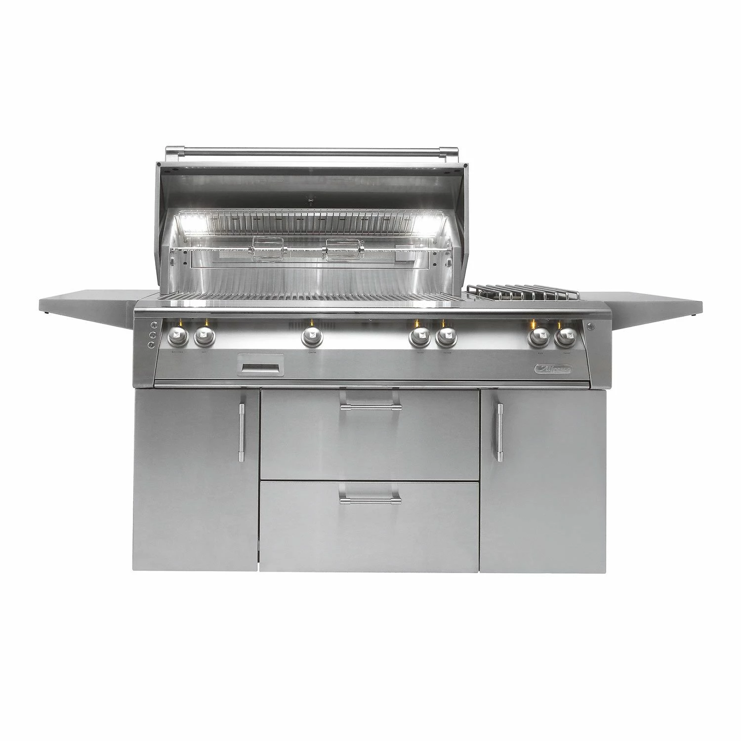 Alfresco ALXE-56C Freestanding Grill, 56-Inch provides a high performance luxury grill that is a terrific option to complete your outdoor kitchen. The 304 stainless steel grill features (3) 18-SR stainless steel main burners producing 82,500 BTUs with 770 square inches of grilling area with the option to upgrade to a Sear Zone infrared burner. The Sear Zone features a “V-shaped” design and reaches temperatures up to 1500°F to produce professional steakhouse results – all while using up to 50% less fuel. Above the burners, the pyramid-shaped ceramic briquettes eliminate hot and cold spots to maximize flavor as they evenly deliver heat to the cooking surface. The premium cooking grates have a special nonstick electro-polished finish, to achieve professional grill marks every time. The heavy-duty stainless steel cart allows for additional storage with spacious double doors and double drawers.
