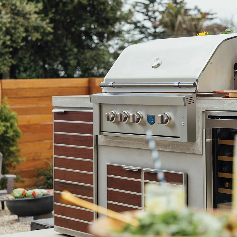 The 30-inch Estate also features a signature Flame Thrower Ignition that shoots a burst of flame to ignite the main burners and is much more reliable than traditional spark ignition systems. The double lined, spring assisted hood keeps hot air in to ensure a consistent grilling environment complete with a built in 3-inch temperature gauge and interior halogen lighting with LED front panel lighting. In addition, the 15,000 BTU infrared back burner offers a high quality rotisserie burner for professional style rotisserie cooking and includes a storage bracket for the rotisserie spit when not in use. Available for both propane and natural gas, this built in grill ensures a complete outdoor kitchen.