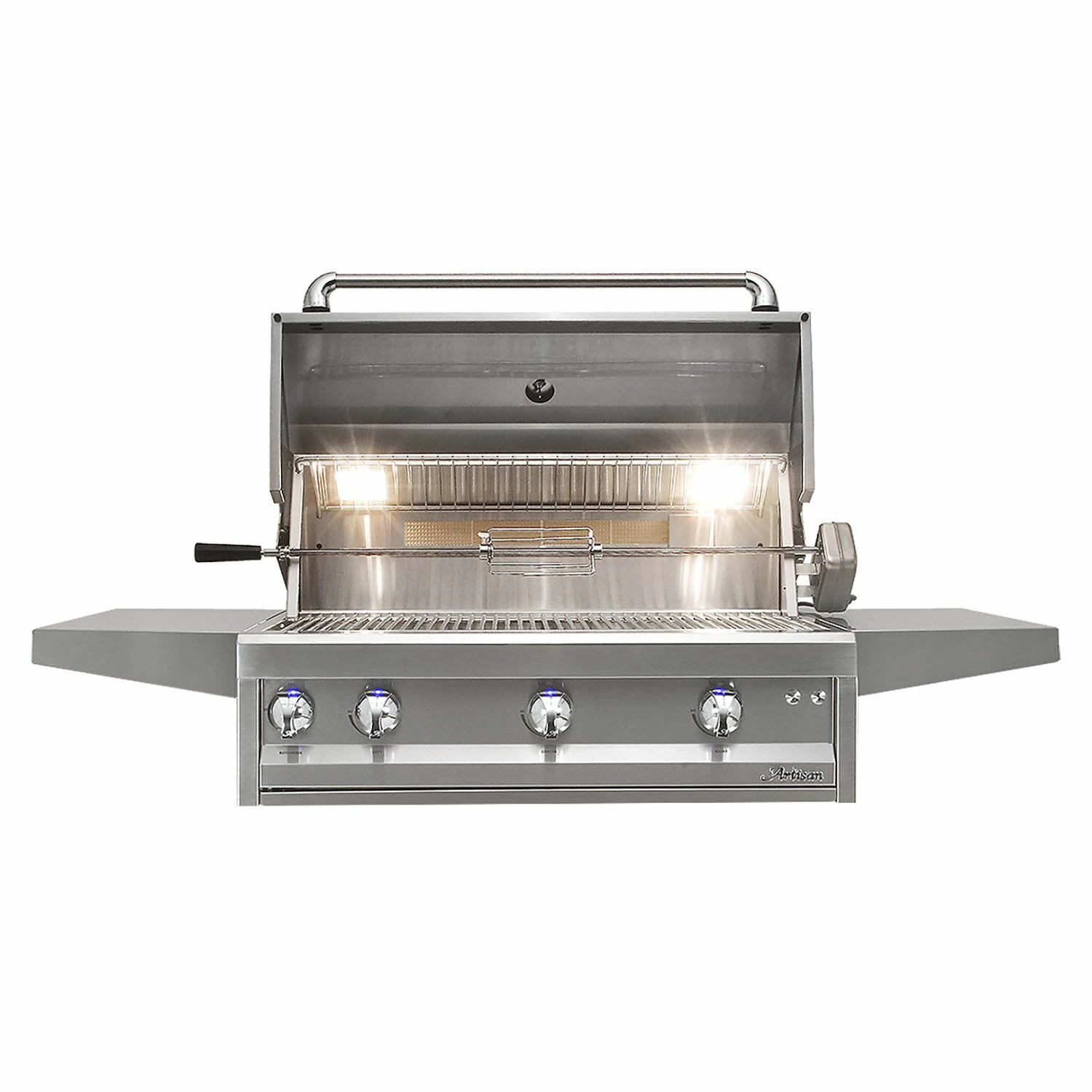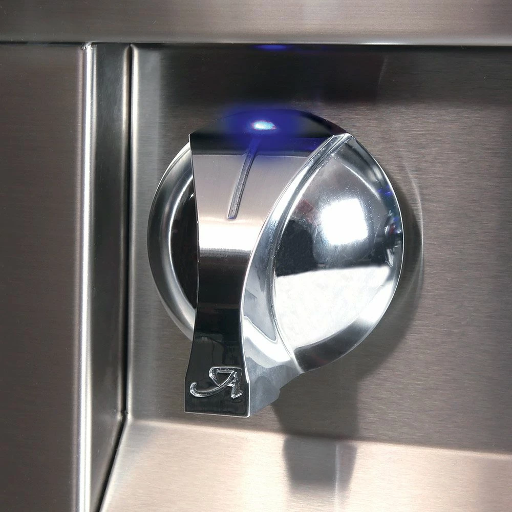 The Artisan Professional Series offers several unique features which help make your grilling experience even more enjoyable. Quality-of-life features like ambient blue LED front panel lighting, a spring-assisted grill hood, and an integrated halogen work light make the grill easier to use. A 110V electronic ignition provides reliable lighting every time, while an integrated rotisserie burner, heavy-duty 50-pound torque rotisserie motor, and rotisserie kit provide dynamic cooking potential. Finally, this grill can be configured with or without an integrated Sear Zone infrared burner capable of providing intense heat and authentic steakhouse results.
