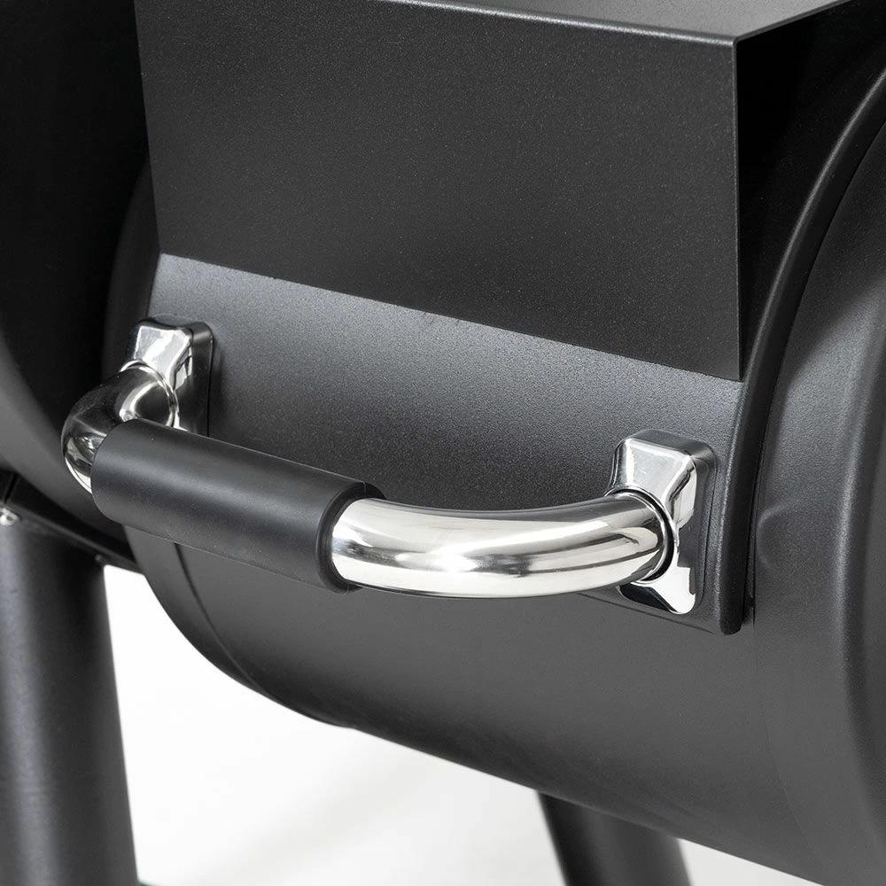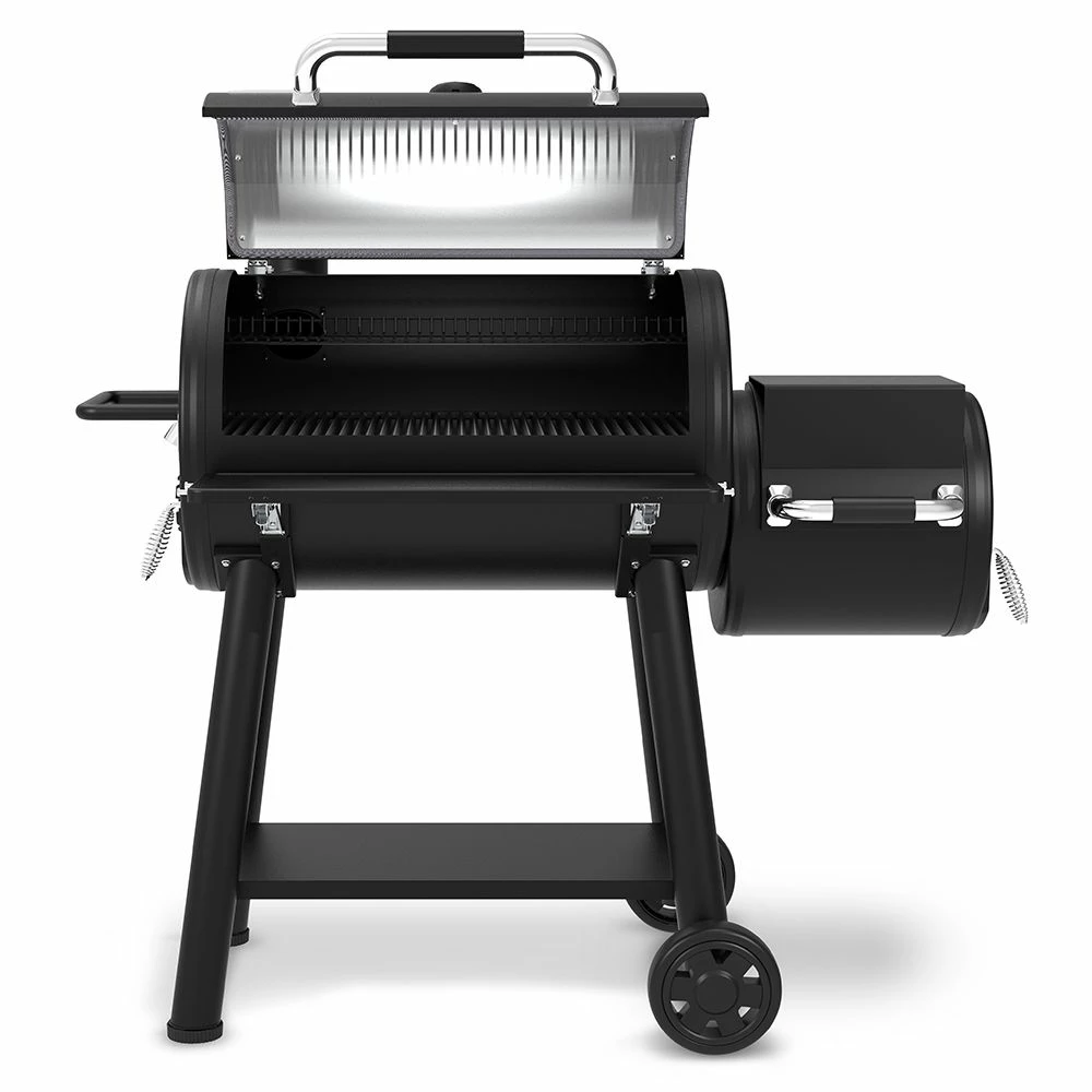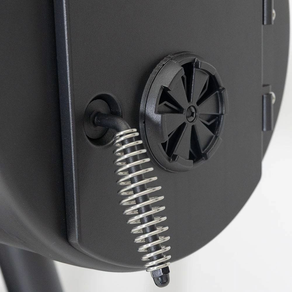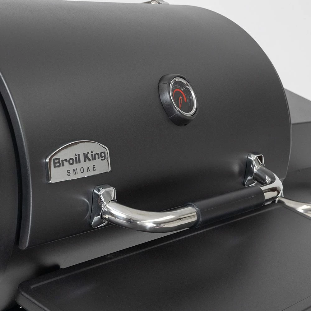 Broil King 958050 Regal Offset 500 Charcoal Smoker, 32-Inches offers a traditional southern-style barrel smoker for your outdoor kitchen. Featuring durable 2mm/14-gauge steel construction, this smoker offers exemplary durability and heat retention. Heavy-duty cast iron cooking grids offer a premium cooking surface, while cast aluminum Roto-Draft dampers offer impressive heat control. A durable steel cooking chamber offers supreme cooking capabilities, while dual-purpose smoke diffusing charcoal trays add to the flavor of your food. Removable front and bottom shelves offer added storage space and convenience, while removable stainless steel ash trays make cleanup simple. Two large eight-inch crack-proof wheels offer easy movement, while four durable steel legs with two leg levelers ensure stability.