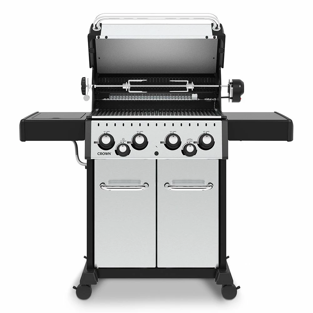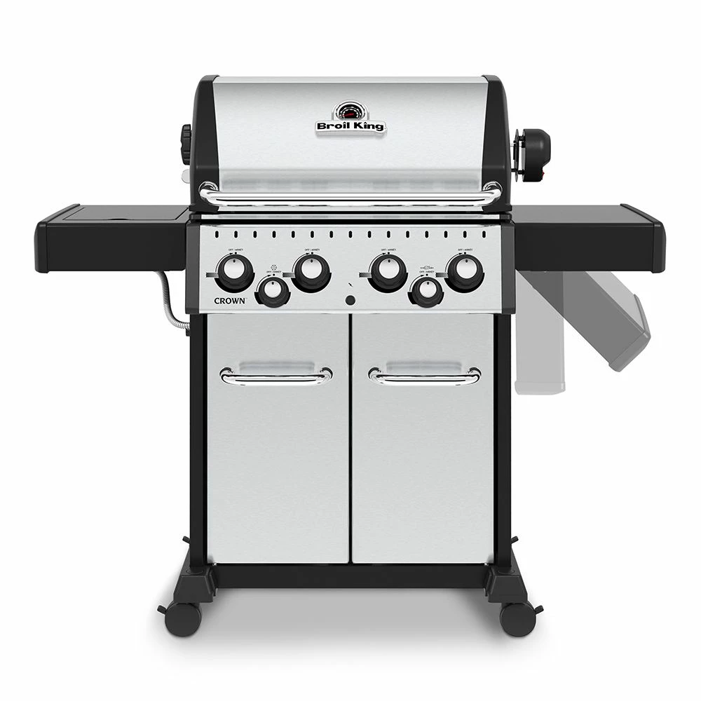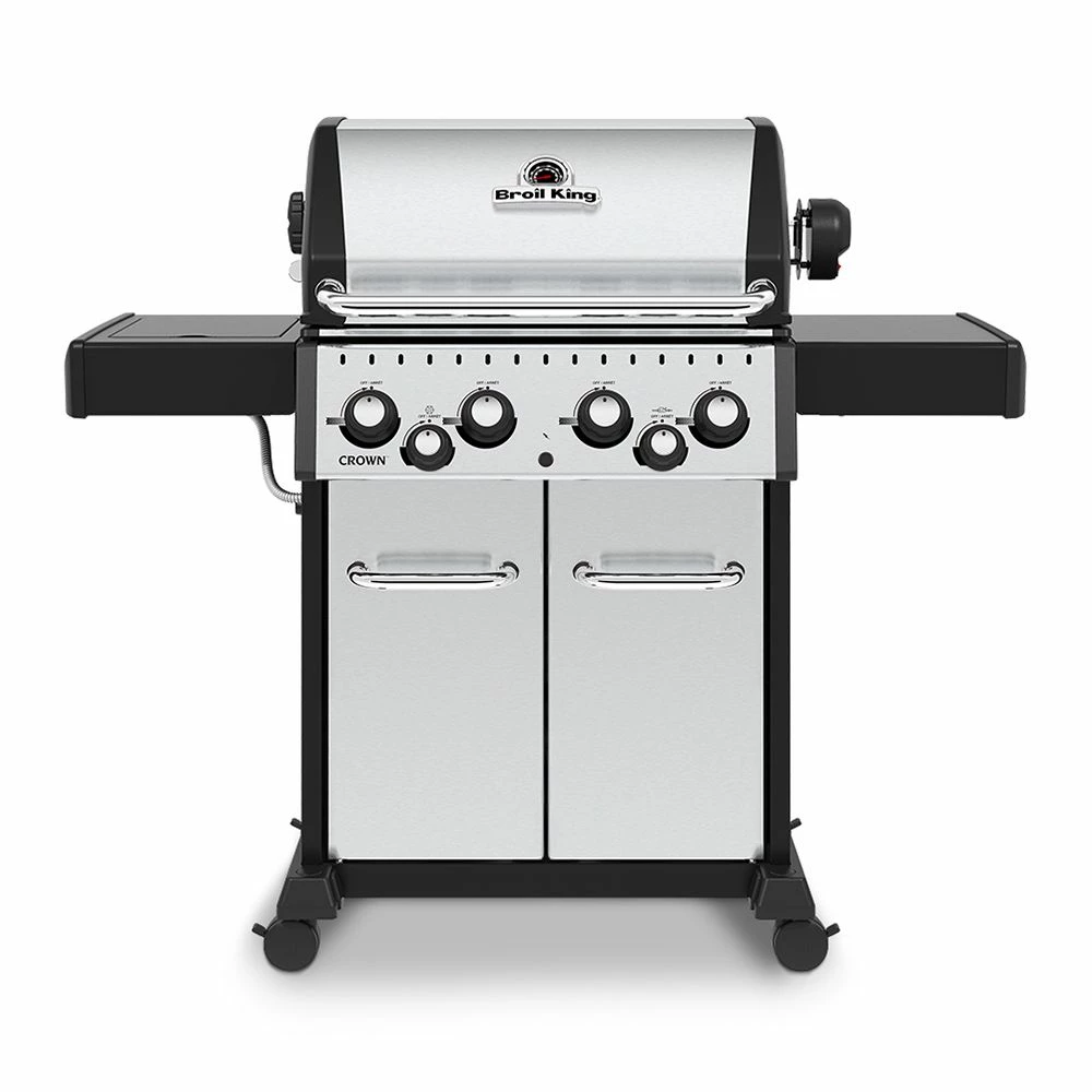 Broil King CRN-S490 Crown S490 Stainless Steel 4-Burner Gas Grill with Rotisserie and Side Burner, 57-Inches offers a premium grilling experience for your outdoor kitchen. This grill features die-cast aluminum and high-grade stainless steel construction for proven durability and excellent heat retention. Heavy duty cast iron cooking grids feature a pointed side for perfect steakhouse sear marks and a grooved side for continuous basting. The stainless steel Flav-R-Wave cooking system offers impressive heat distribution across the entire surface of the grill, while drippings that fall onto the Flav-R-Wave system are instantly vaporized. Four Dual-Tube burners feature high quality, heavy-duty stainless steel construction with a tube-in-tube, side-ported design for even heating. Linear-Flow valves with 180-degree Sensi-Touch control knobs offer smooth and simple heat control to precisely control the temperature of your grill.