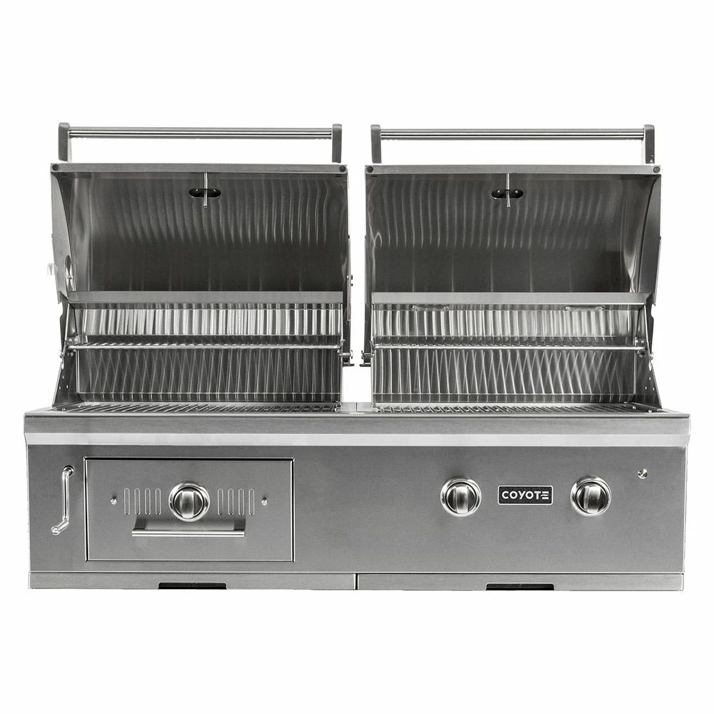 Coyote Stainless Steel Built-In Gas & Charcoal Combo Grill, 50-Inch (C1HY50) provides a premium hybrid grill for your outdoor kitchen space. On the gas half of this grill, two high-performance Coyote I-Burners offer heating capabilities up to 40,000 BTU of heat output across 600 square inches of cooking space. In addition, integrated interior lighting makes low-light grilling easier. On the charcoal side of the grill, an adjustable fuel tray and adjustable dampers allow for precise heating and airflow control as well as an additional 600 square inches of cooking space. This base grill can also be upgraded with a variety of products and accessories custom built for this grill model (sold separately).