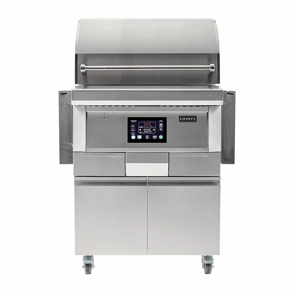 Coyote Stainless Steel Freestanding Pellet Grill, 28-Inch (C1P28-FS) provides a premium pellet grill option for your outdoor kitchen. Designed with ease-of-use in mind, this pellet grill takes the guesswork out of grilling with an intuitive digital touch display, Smart Drop pellet feed and three included temperature probes, so you’ll always know the conditions inside your grill. This grill features a temperature range of 175 degrees to 650 degrees Fahrenheit and features a 12-pound hopper capacity to allow for low-and-slow cooking, high temperature grilling and everything in between. A front-loading pellet hopper and spring assist hood make the grill even easier to use, while the Versa-Rack cooking system allows for cooking on multiple surfaces for greater cooking capacity. Additional user-friendly features include interior lighting, a temperature probe LED and an electronic power ignition.