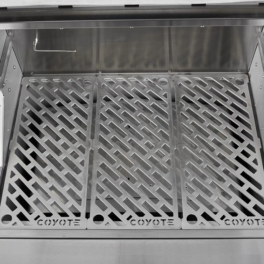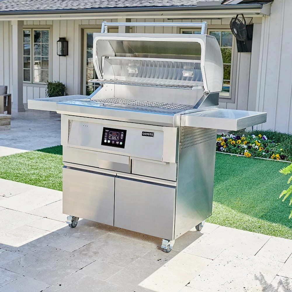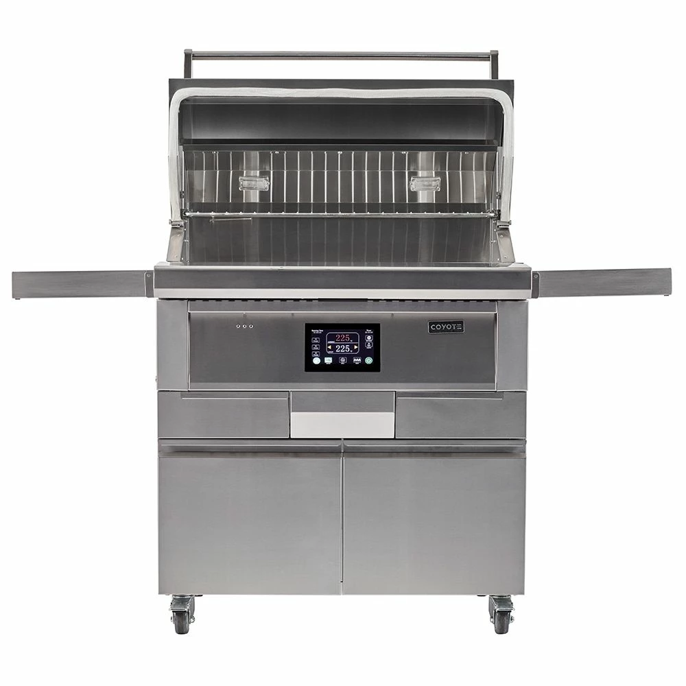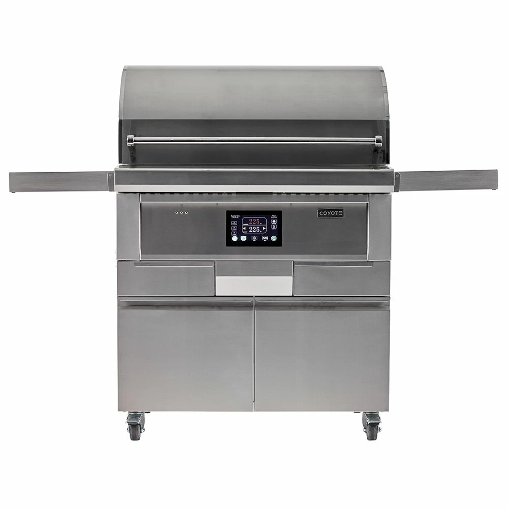Coyote Stainless Steel Freestanding Pellet Grill, 36-Inch (C1P36-FS) provides a premium pellet grill option for your outdoor kitchen. Designed with ease-of-use in mind, this pellet grill takes the guesswork out of grilling with an intuitive digital touch display, Smart Drop pellet feed and three included temperature probes, so you’ll always know the conditions inside your grill. This grill features a temperature range of 175 degrees to 700 degrees Fahrenheit and features a 17-pound hopper capacity to allow for low-and-slow cooking, high temperature grilling and everything in between. A front-loading pellet hopper and spring assist hood make the grill even easier to use, while the Versa-Rack cooking system allows for cooking on multiple surfaces for greater cooking capacity. Additional user-friendly features include interior lighting, a temperature probe LED and an electronic power ignition.