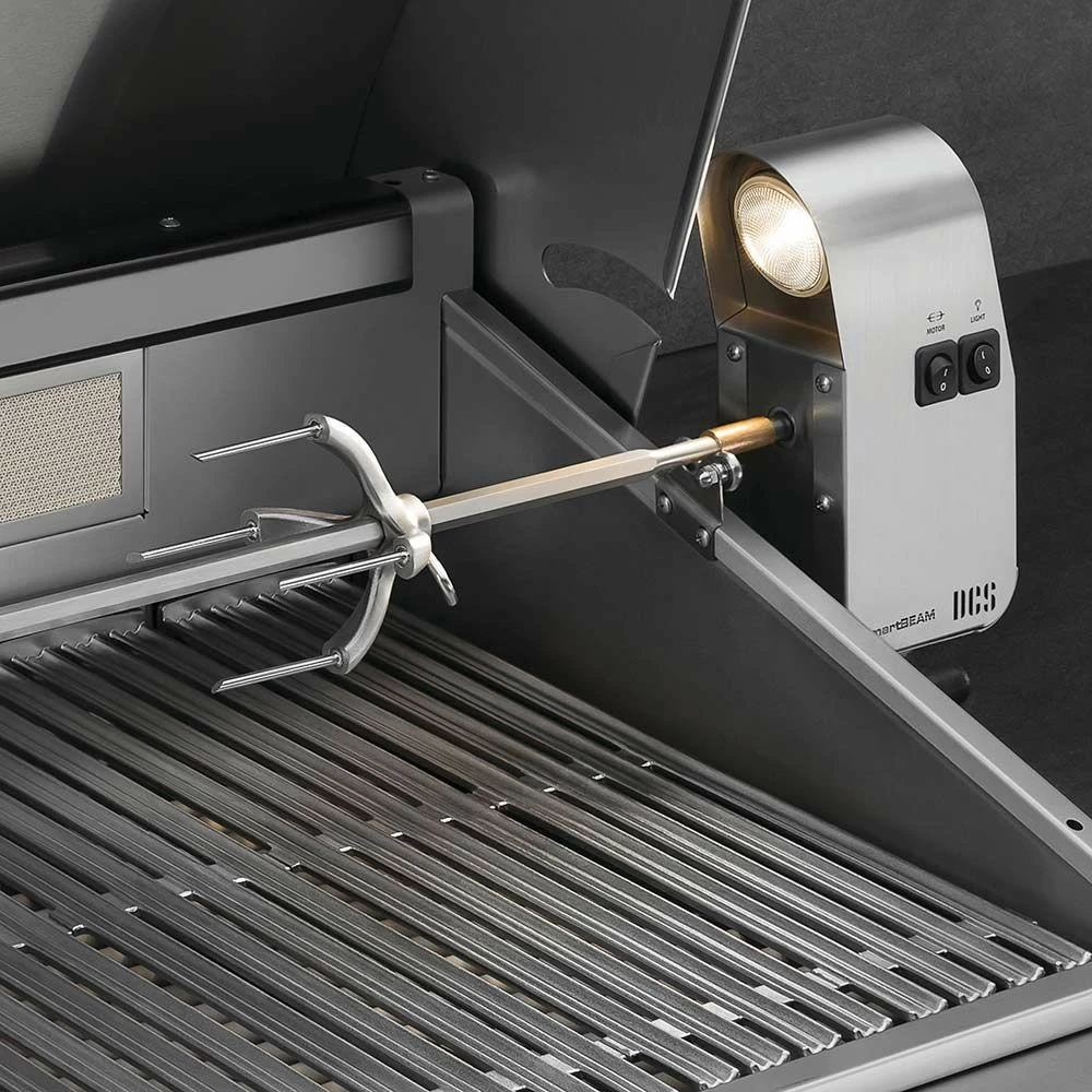 - Rotisserie Burner – Dedicated infrared rotisserie burner rated up to 18,000 BTU for controlled searing with heavy duty motor and stainless steel rod with adjustable forks with 50 lb capacity