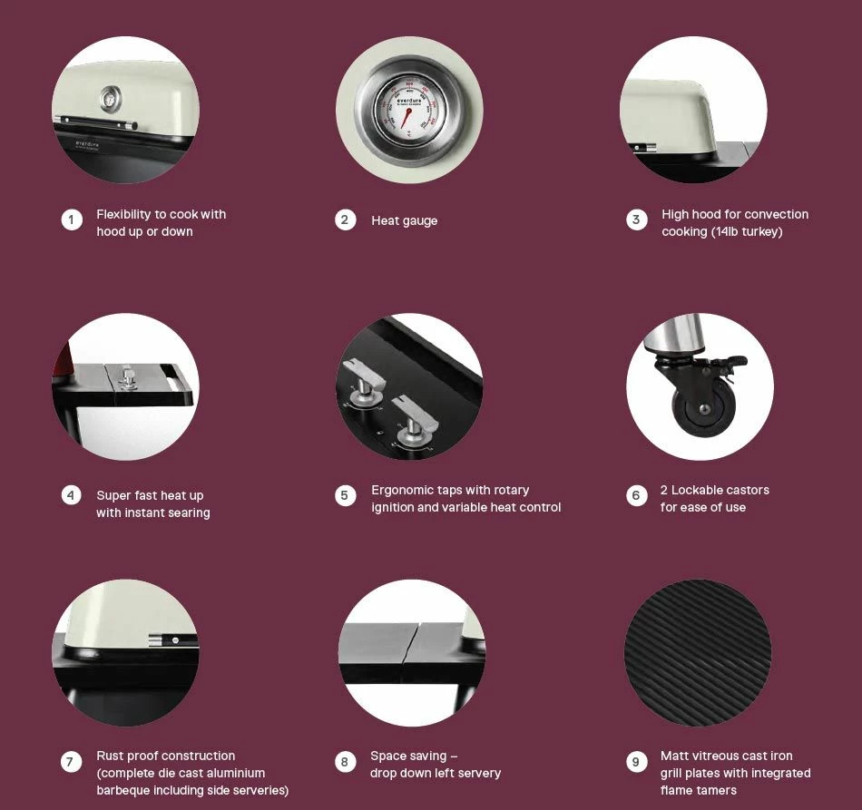 - Quality Construction – Die cast aluminum body for rust prevention and enamel coated hood and grill plates