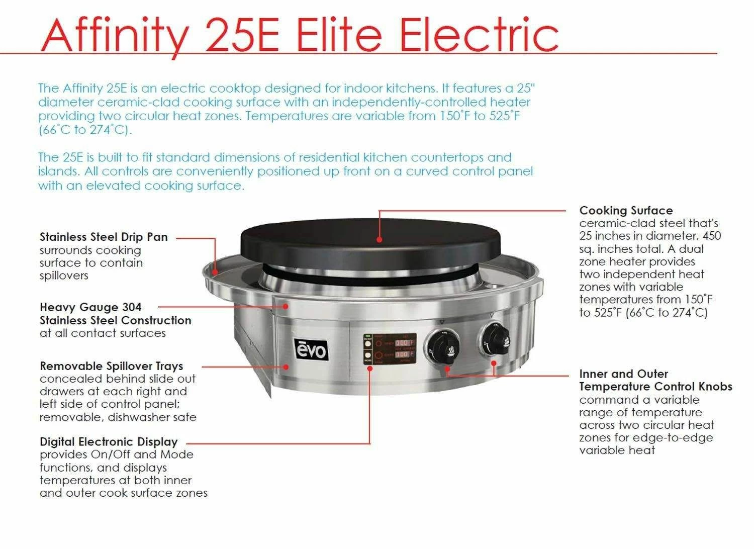 Evo 10-0061-EL Affinity 25E Series Indoor Built-in Electric Grill provides a uniquely versatile grilling machine to enhance your indoor cooking experience. The complete heavy gauge 304 stainless steel construction ensures a long lasting and durable product designed to withstand the rigors of the kitchen while the dual zone electric heaters provide variable temperatures between 150°F and 525°F. The solid cooking surface is constructed from ceramic clad steel to provide a heavy duty cooktop that holds heat extremely well and is 25 inches in diameter to offer a robust 450in² of cooking surface all controlled by 2 burner knobs that control the inner and outer zones for edge to edge even heat.