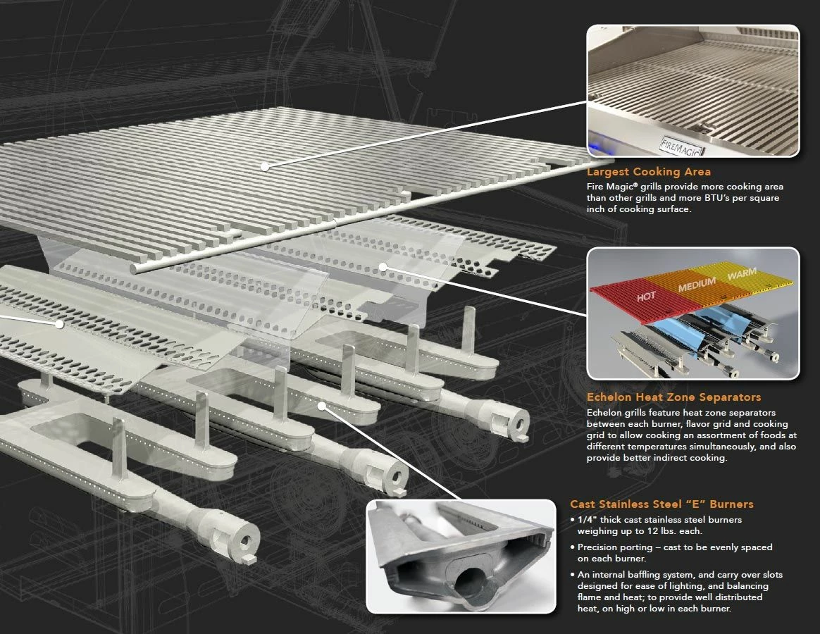 - “E” Burners Made from heavy gauge cast stainless steel, the “E” burners are designed to provide enormous BTU capability, even heat distribution, and are guaranteed for life