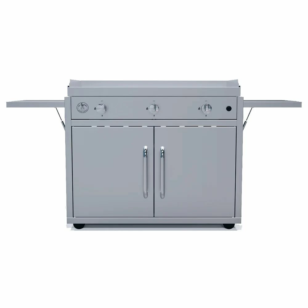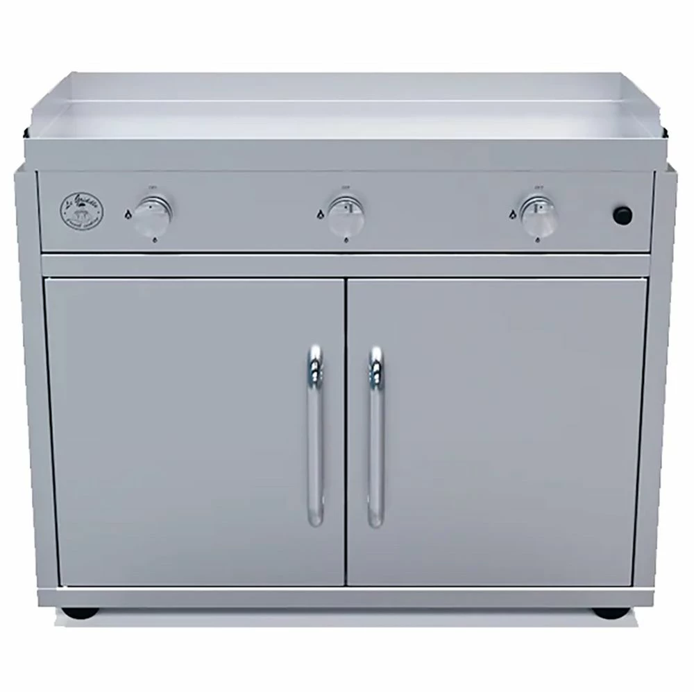 Le Griddle Big Texan Freestanding Dual Fuel Gas Griddle provides a truly innovative option to take your outdoor kitchen to the next level. Featuring a patented Dual Plate System that uses aircraft technology to combine the heat-retaining capabilities of cast iron with the durability and weather resistance of 304 stainless steel, this outdoor griddle provides an exceptional experience that can’t be beat by other brands. You’ll never have to worry about hot and cold spots again, plus you’ll enjoy the capability of high-heat searing that can normally only be found in professional kitchens. There’s a reason most of the best restaurants in the world prefer cooking on a flat top griddle grill, and you can bring that caliber of cuisine to your own backyard with Le Griddle. This griddle comes with a smart 304 stainless steel cart with convenient collapsible side shelves and a substantial storage compartment with room for all your griddle accessories, making it the perfect all-in-one griddle.