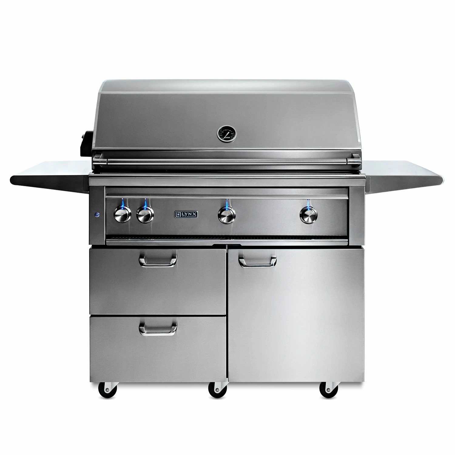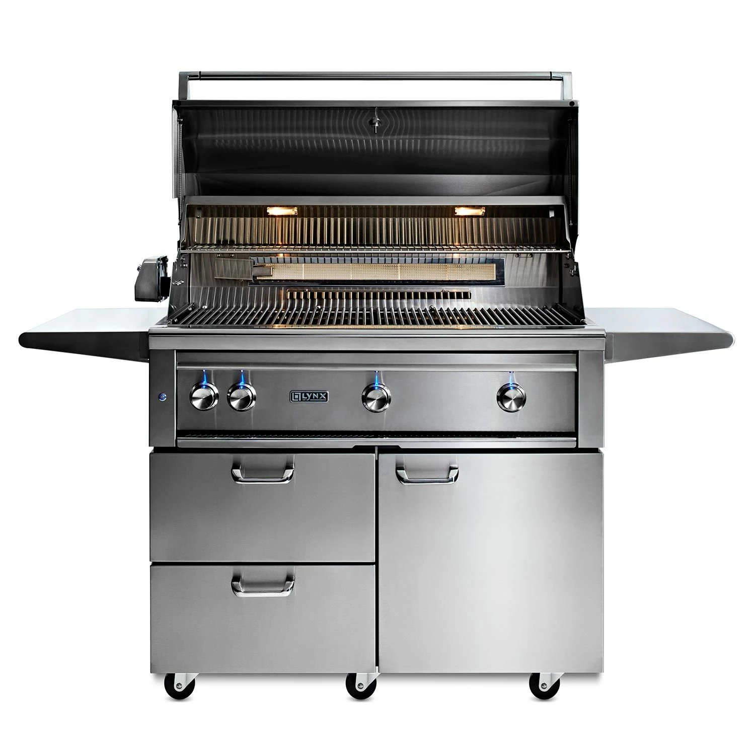 Lynx L42FR Professional Gas Grill On Cart, 42-Inch combines innovative features, unparalleled performance, and superior craftsmanship to create one of the most advanced grills on the market. This BBQ grill features a heavy 16-gauge 304 stainless steel construction with smooth welded joints and polished mirrored edges for a blend of style and durability that will stand up to the elements in any climate. Designed for professional-style performance, the premium ceramic burners provide a whopping 25,000 BTU for extreme high heat output that’s evenly distributed while the ceramic radiant briquettes provide a charcoal-like infrared heat for an enhanced gas grilling experience. With LED backlit control knobs, internal halogen grill lights, a removable smoker box, rotisserie system with infrared rear burner, and a hot-surface ignition, this unit combines all of the requisite features of a high-end grill and then some – so you can create the best barbecue. An optional double side burner provides an excellent opportunity to customize your grilling experience.