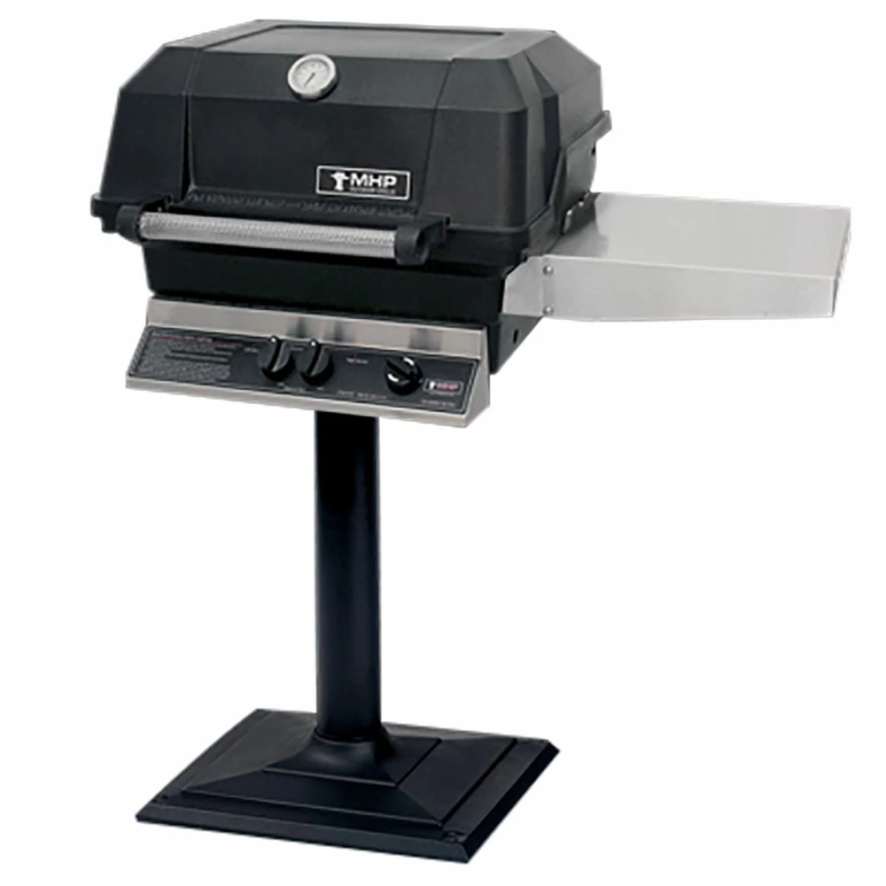 - This grill features an aluminum post base for convenient semi-permanent mounting.