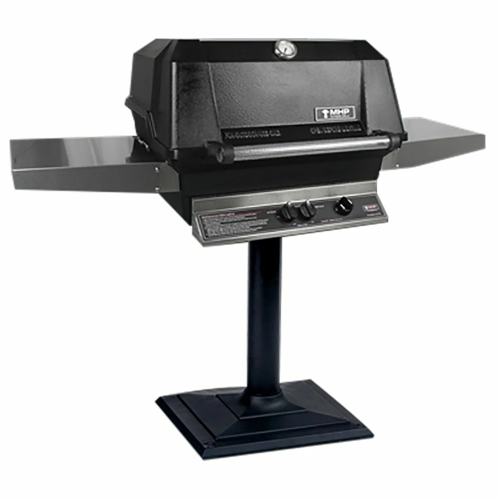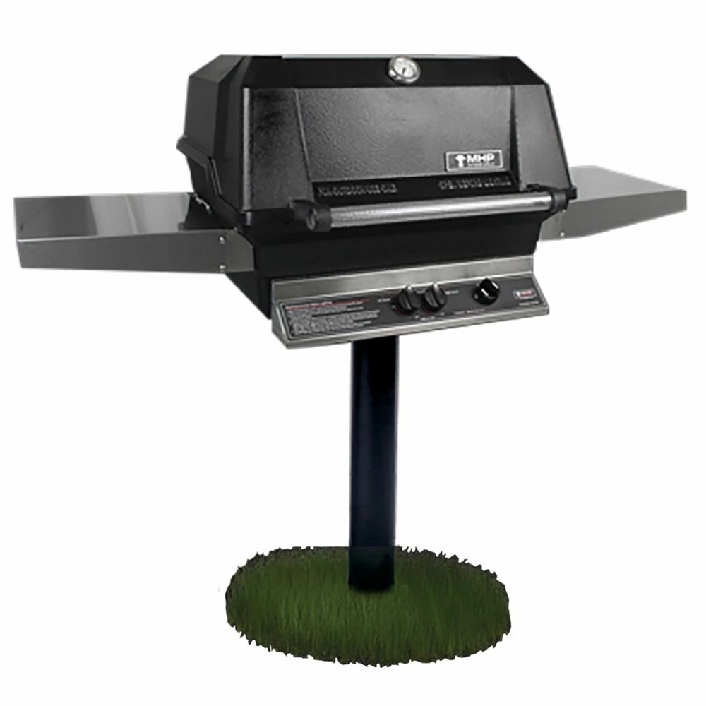 Modern Home Products AMCWMP Gas Grill On Post with Stainless Steel Shelves offers a classic grill design with modern refinements to provide an exceptional grill for your outdoor kitchen. This grill features a cast aluminum grill body with a black powder-coated finish for a design that’s both attractive and durable. Heavy-duty stainless steel cooking grids offer good heat transfer with a premium build quality, while the stainless steel h-burners underneath provide a uniform flame distribution on each port for even heating across the grilling surface. This grill also features a durable stainless steel drop-in warming rack to provide a convenient secondary grilling area. A premium rotary ignitor provides simple and reliable startup every time you grill, while 430 stainless steel drop-down side shelving provides added surface space while grilling.