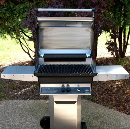 Modern Home Products TJK2 Gas Grill On Patio Base, 27-Inch offers a premium standing gas grill option that combines hand-crafted, high quality materials with superior function and timeless tradition. The grill features stainless steel construction to provide an elegant, durable hood that promotes heat retention while the rolling Sta-Kool stainless steel hood handle makes opening your grill a breeze. This unit includes 5/16-inch thick stainless steel grids and a secondary stainless steel warming rack or can be upgraded to include two aluminum rust-free SearMagic grids and a SearMagic warming rack. The reversible SearMagic technology is characterized by one wide-ribbed side for achieving professional sear lines and one smooth side for foods such as fish or vegetables. The H-shaped dual burner along with the FlavorMaster porcelain briquettes work together to create 40,000 BTU of power and provide precise heat control for the perfect BBQ flavor. The on-post grilling option offers a 48-inch in-ground post or a bolt-down post for your grilling needs – these posts are aluminum constructed with stainless steel tubing to ensure a durable, reliable setup. You also have the option to pair your grill with a patio base on either a black aluminum or stainless steel column. All of this, in addition to the 433 square inches of main cooking area, two added stainless steel side shelves and built-in temperature gauge, makes for a grill that is just as functional as it is luxurious. Upgrade your grill with a SearMagic Infrared Zone Side Burner, Stainless Steel Side Burner or Infra-Roast Rear Rotisserie Burner.