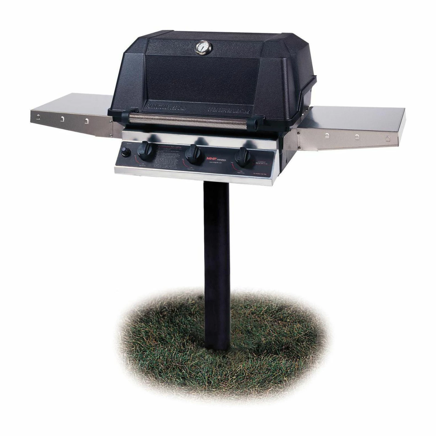 Modern Home Products WHRG4 Hybrid Gas Grill with SearMagic Grids On Patio Base, 27-Inch offers a premium built-in gas grill option that combines hand-crafted, high quality materials with superior function and timeless tradition. The grill features cast aluminum construction to provide a durable housing and grill bottom that promotes heat retention and rust resistance while the rolling Sta-Kool stainless steel hood handle makes opening your grill a breeze. This unit includes aluminum rust-free SearMagic grids and a stainless steel swing-away warming rack. The reversible SearMagic technology is characterized by one wide-ribbed side for achieving professional sear lines and one smooth side for foods such as fish or vegetables. The hybrid burner system consists of 2 cast stainless steel oval burners and 1 ceramic infrared burner that works together with the FlavorMaster porcelain briquettes to create 48,000 BTU of power and adds a high performance searing option for improved grilling flexibility. The on-post grilling option offers a 48-inch in-ground post or a bolt-down post for your grilling needs – these posts are aluminum constructed with stainless steel tubing to ensure a durable, reliable setup. You also have the option to pair your grill with a patio base on either a black aluminum or stainless steel column. All of this, in addition to two added stainless steel side shelves, the 433 square inches of main cooking area and built-in temperature gauge, makes it is easy to see why the WHRG4 from MHP is an ideal grilling option for anyone who enjoys different grilling methods. Upgrade your grill with a SearMagic Infrared Zone Side Burner, Stainless Steel Side Burner or Infra-Roast Rear Rotisserie Burner.