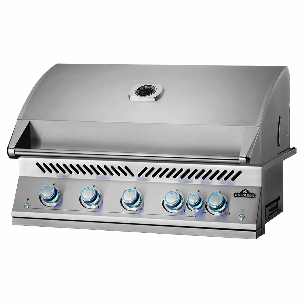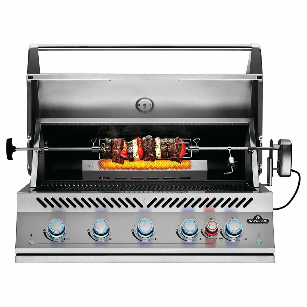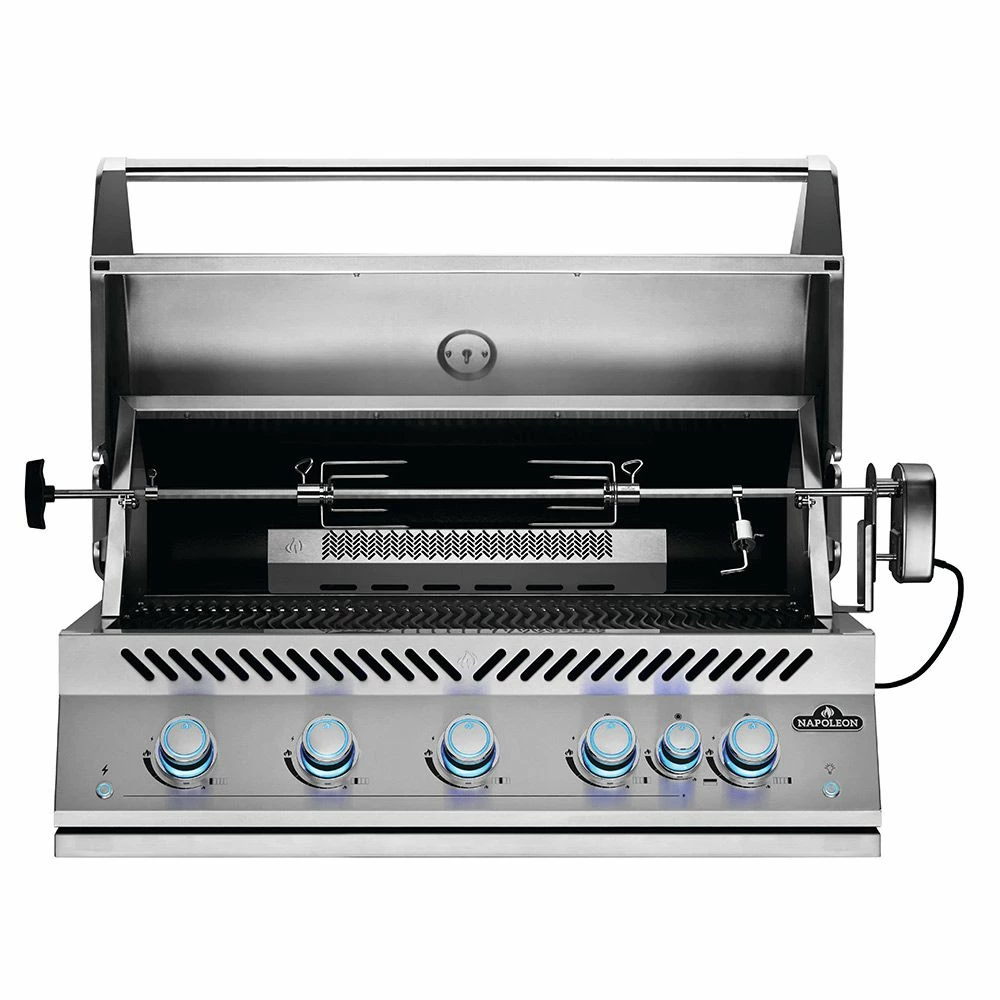Napoleon BIG38RBSS Stainless Steel Built-In 700 Series 38-Inch Infrared Rear 5-Burner Gas Grill Head provides a premium centerpiece for your outdoor kitchen space. Featuring marine-grade stainless steel construction, this grill has been engineered to impress. With five stainless steel main burners and a rear infrared burner, this grill offers impressive heating capacity. Napoleon’s iconic 9.5mm stainless steel WAVE cooking grids offer a premium cooking surface, while dual position warming racks offer more space for warming, toasting, and baking. A commercial-quality rotisserie kit offers low-and-slow roasting capability, while integrated rotisserie kit storage offers a convenient place to stow the rotisserie when not in use. Dual-level stainless steel sear plates create even heat distribution and protect burners, while an integrated temperature gauge accurately measures the temperature of your grill.