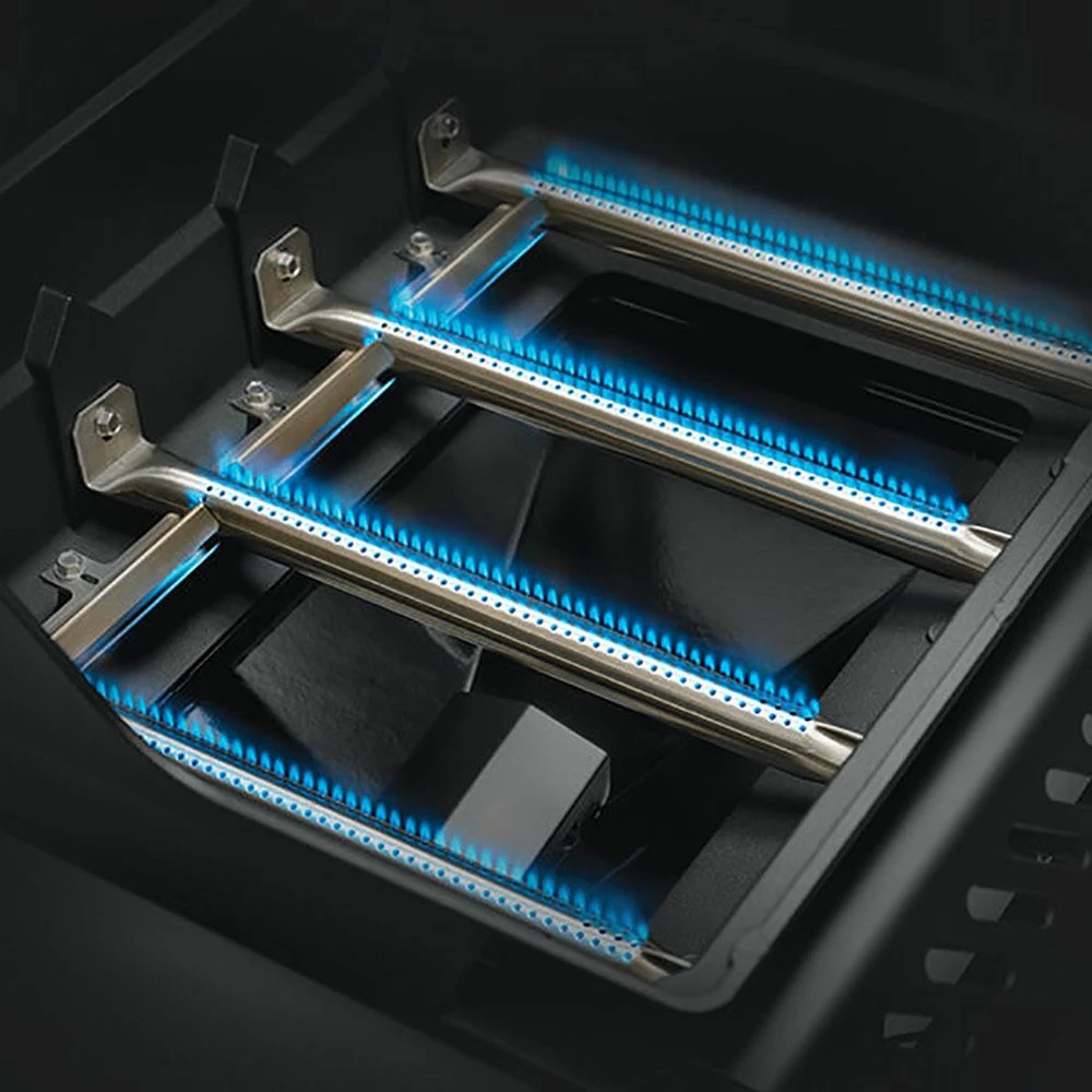 - Three stainless steel burners can be controlled individually for easy zone heating