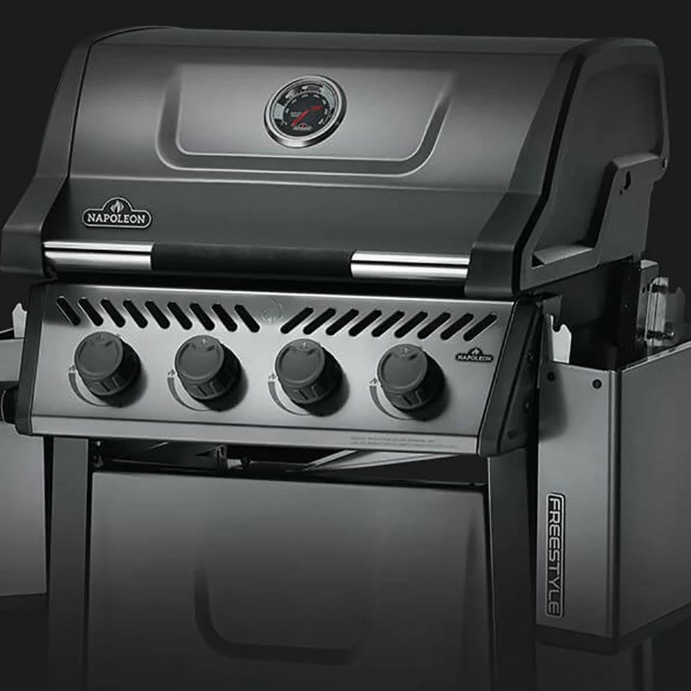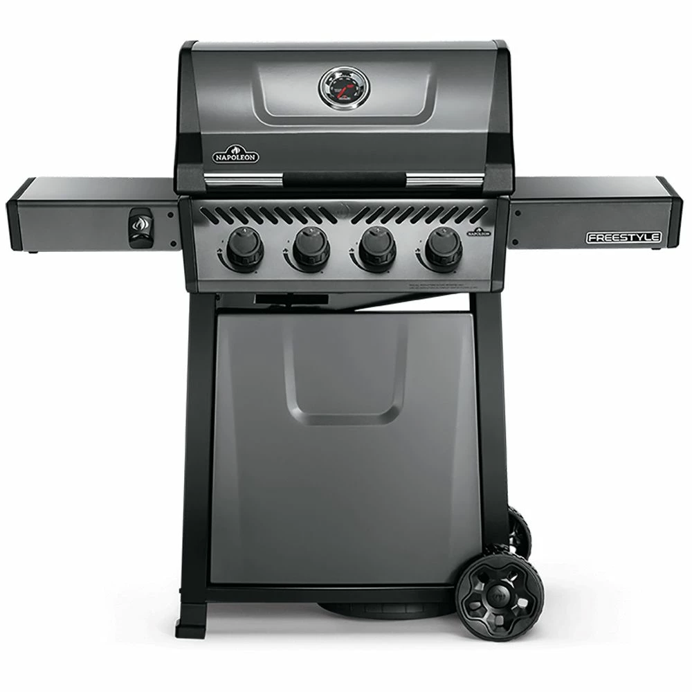 Napoleon F425DGT Freestyle 425 Gas Grill On Cart serves up a high-quality grill that combines innovative tech with modern convenience features for a top-notch cooking experience. Napoleon’s signature JETFIRE ignition ensures an easy and reliable start up every time, and the iconic Wave cooking grids built from porcelain-coated cast iron provide the kind of sear marks every grillmaster loves to see. The foldable side shelves feature tool hooks and a built-in bottle opener for an all-in-one backyard hub.