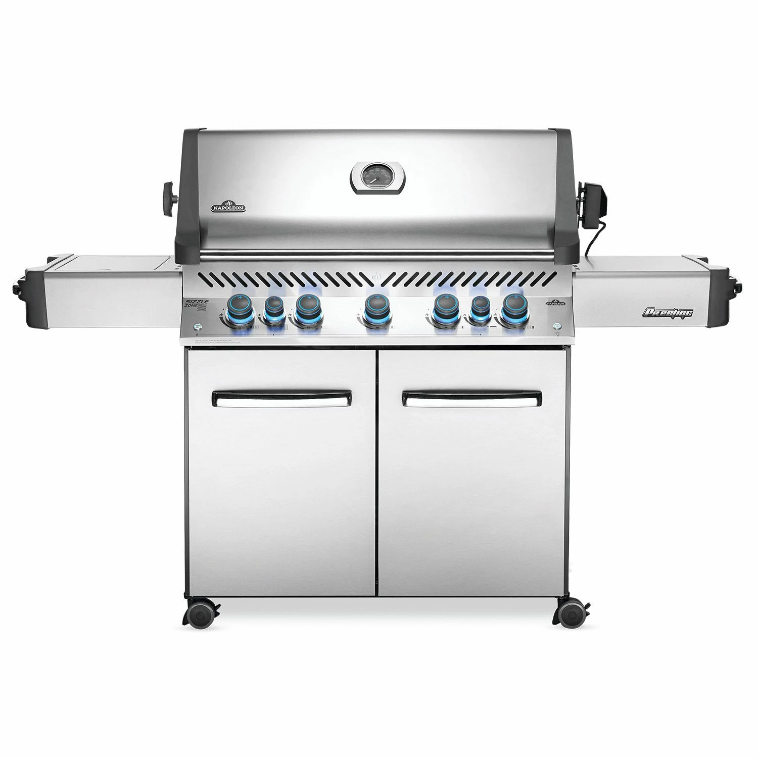 Napoleon P665RSIB Prestige 665 Gas Grill On Cart with Rotisserie and Side Burner, 37-Inches delivers high end performance without the price tag of a high end grill. The solid 304 stainless steel construction is designed for long term durability and ensures the grill will hold up to the elements. The (4) main grilling burners are rated for a 12,000 BTU maximum and feature a solid 304 stainless steel tube construction while the stainless steel sear plates help protect the burners and provide even heat distribution, preventing hot and cold spots across the 665in² grill surface.