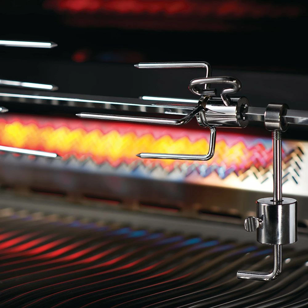 - Rotisserie Burner The rear infrared rotisserie burner is rated for 18,000 BTU to allow professional style rotisserie cooking and elevate the versatility of your Napoleon grill – enjoy the slow, savory flavors of rotisserie style cooking