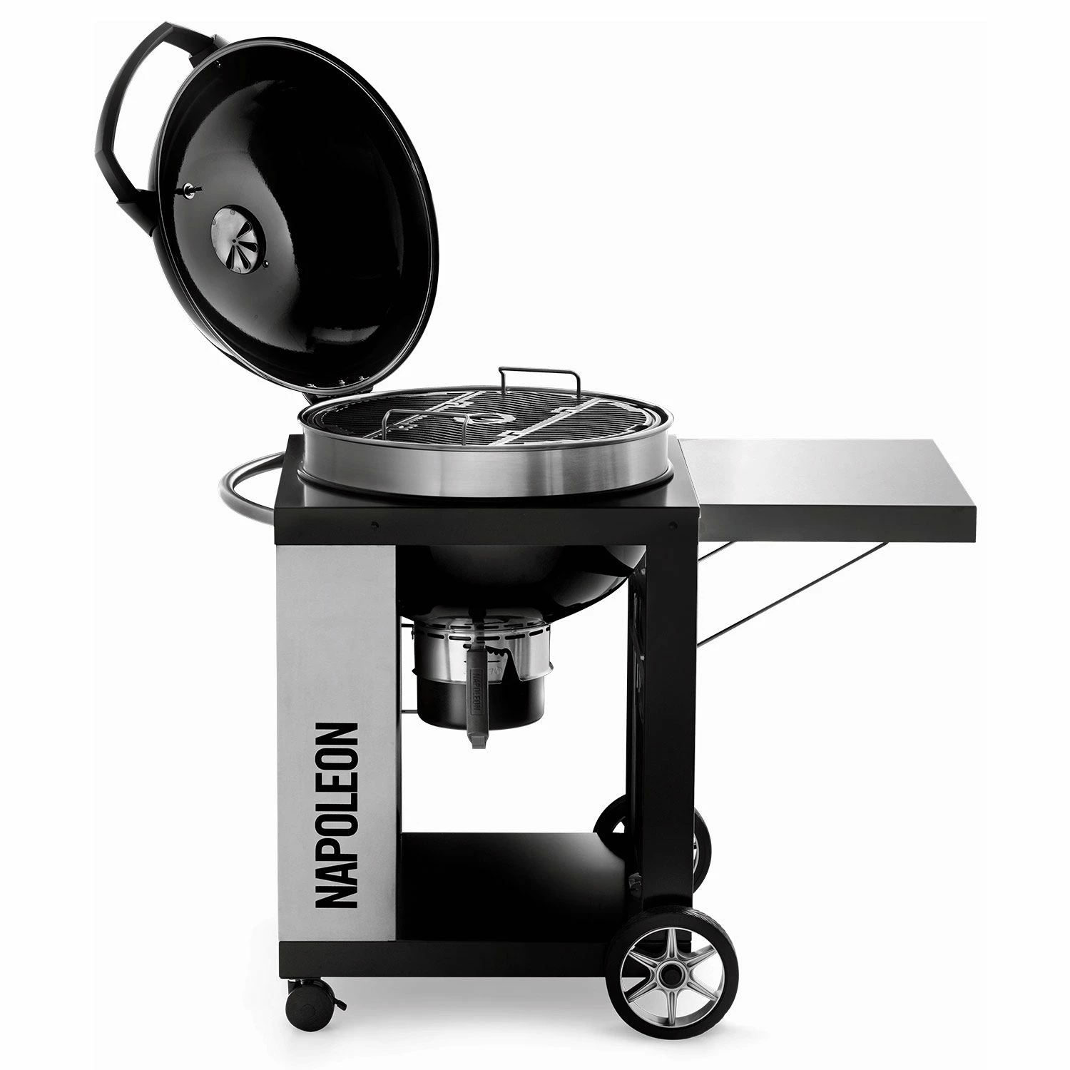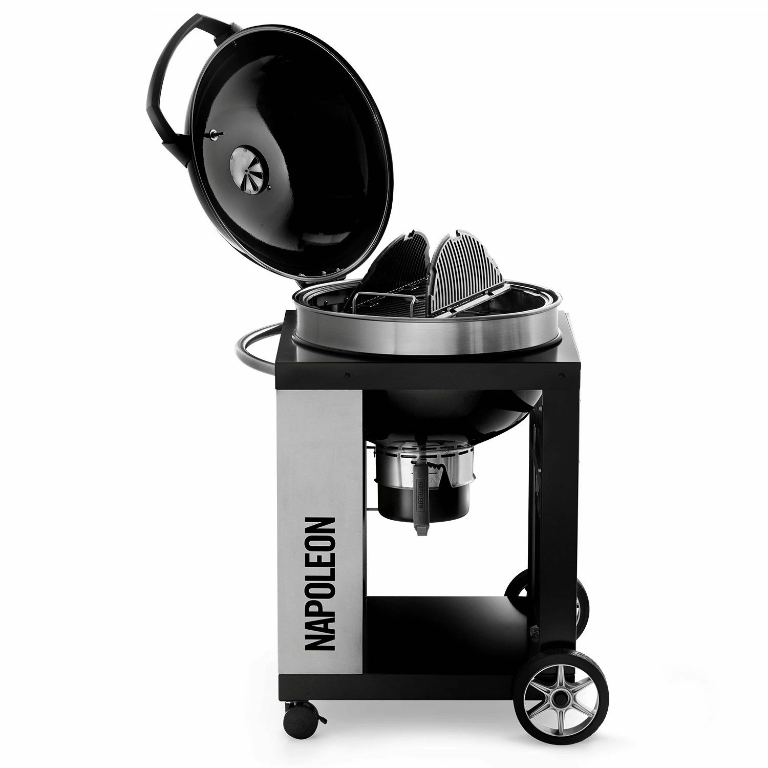Napoleon PRO22K-CART-2 Rodeo Pro Charcoal Kettle Grill on Cart provides a traditional charcoal grill with tremendous maneuverability; the 22.5″ diameter kettle provides 365 square inches of grilling surface. The heavy gauge black porcelain lid and bowl are durable and the heavy steel ash catcher makes ash removal a breeze while the stainless steel charcoal grate and cast iron hinged cooking grids allow fast and easy direct and indirect cooking. The unique cart features a fold down stainless steel side shelf with two heavy duty wheels and two casters for easy mobility whether you’re on your patio or taking your grill on the go.
