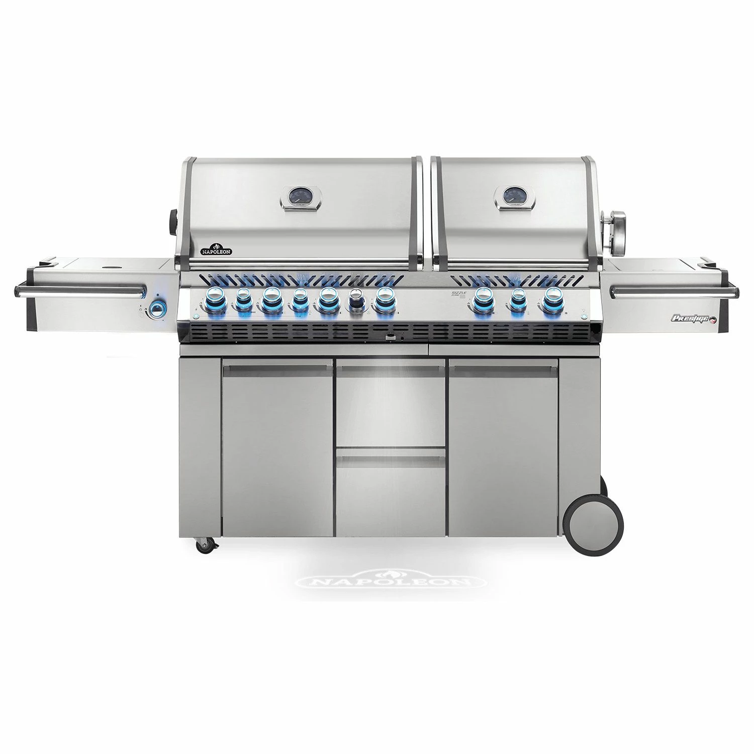 Napoleon PRO825RSBISS-3 Prestige PRO 825 Series Gas Grill On Cart with Rotisserie and Side Burner, 45-Inches delivers high end performance without the price tag of a high end grill. The solid 304 stainless steel construction is designed for long term durability and ensures the grill will hold up to the elements. The (4) main grilling burners are rated for a 12,000 BTU maximum and feature a solid 304 stainless steel tube construction while the stainless steel sear plates help protect the burners and provide even heat distribution, preventing hot and cold spots across the 500in² main grill surface while the secondary grill hood features (2) 14,000 BTU ceramic infrared burners that can reach up to 1,800 F to achieve steakhouse quality searing; also included is an independent 8,000 BTU warming burner for added versatility.