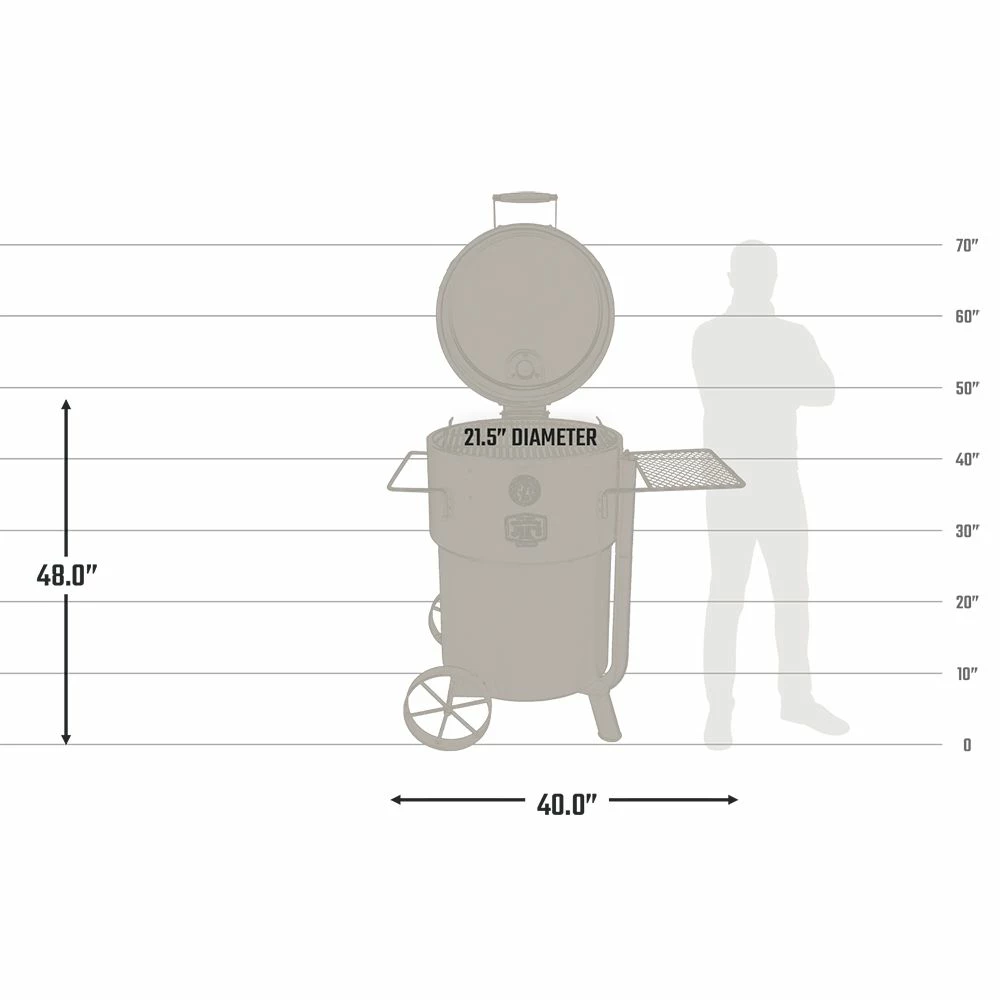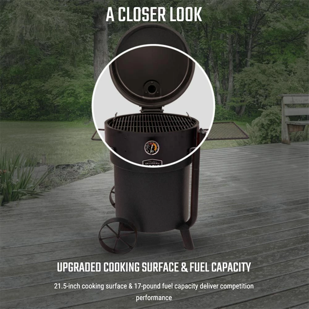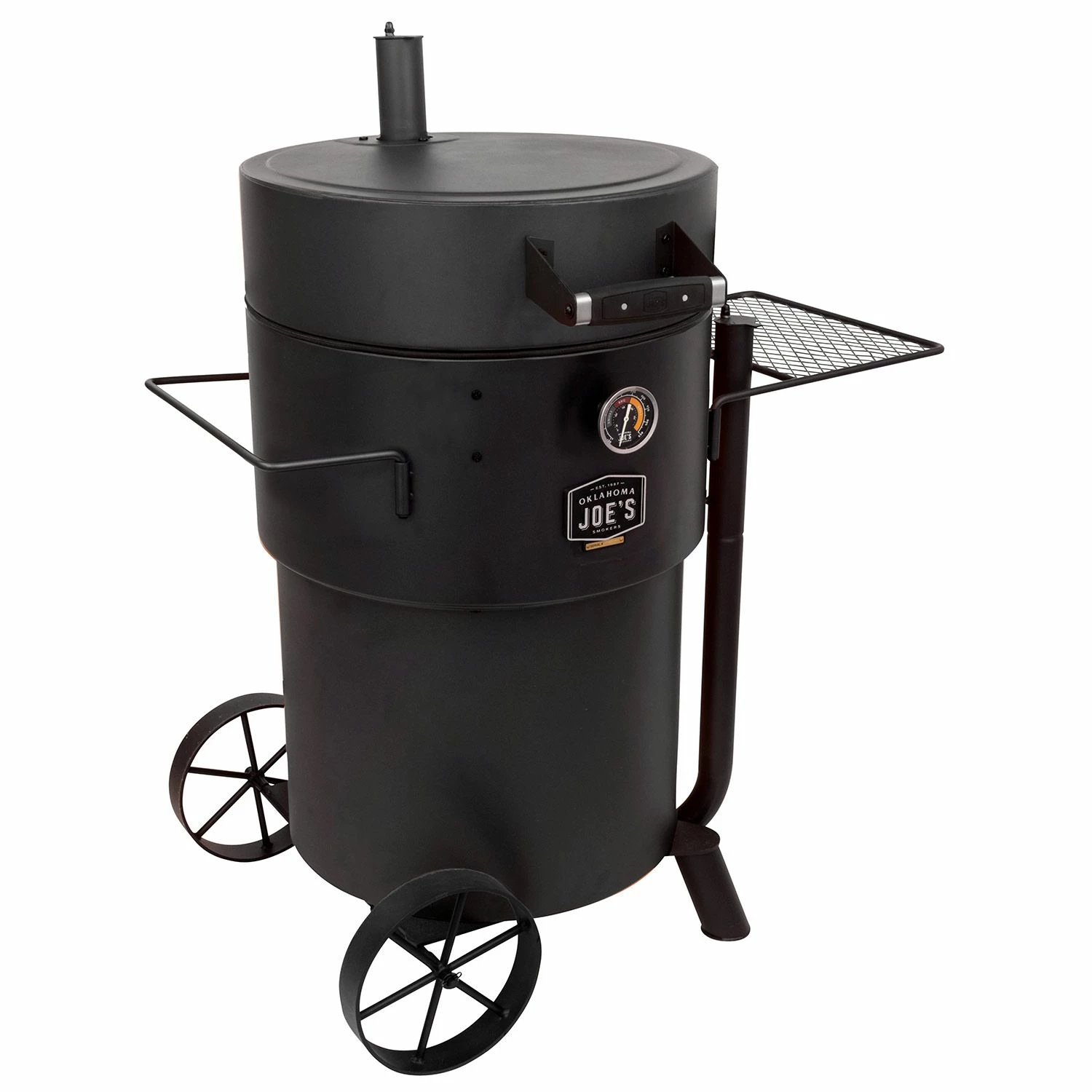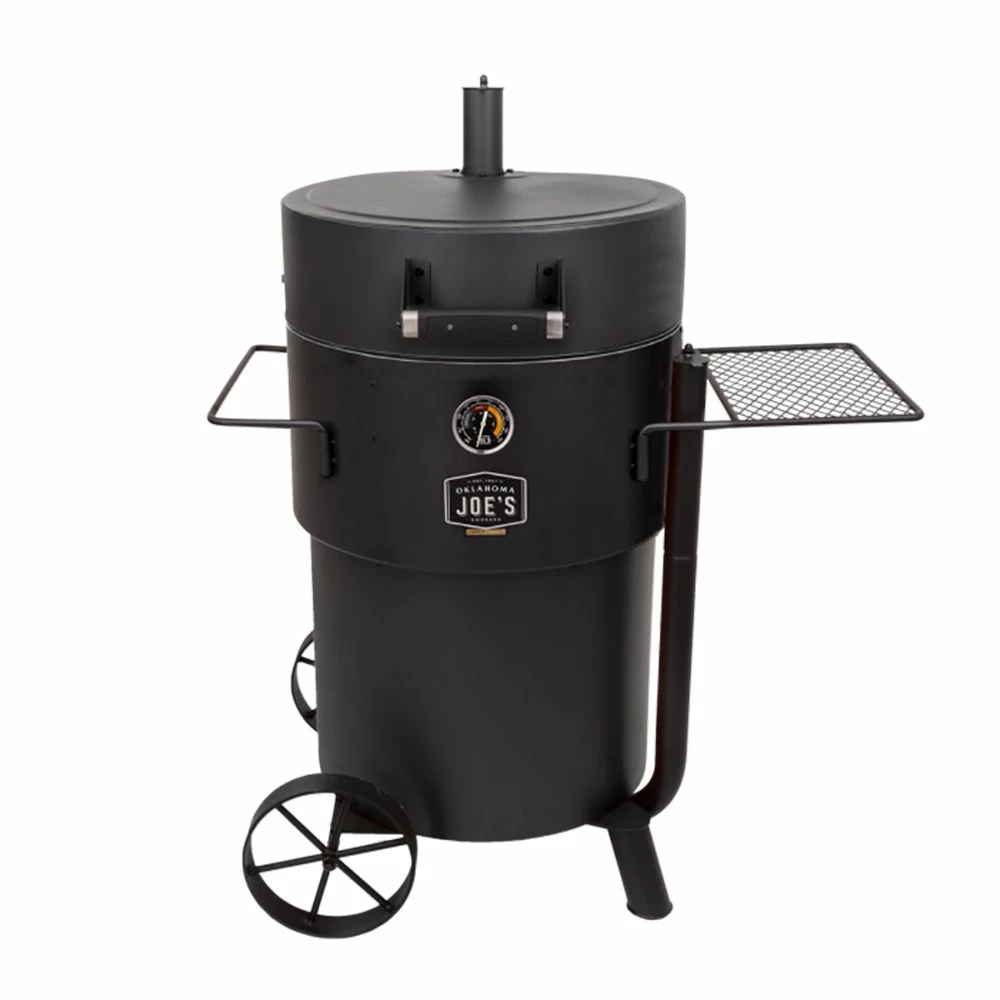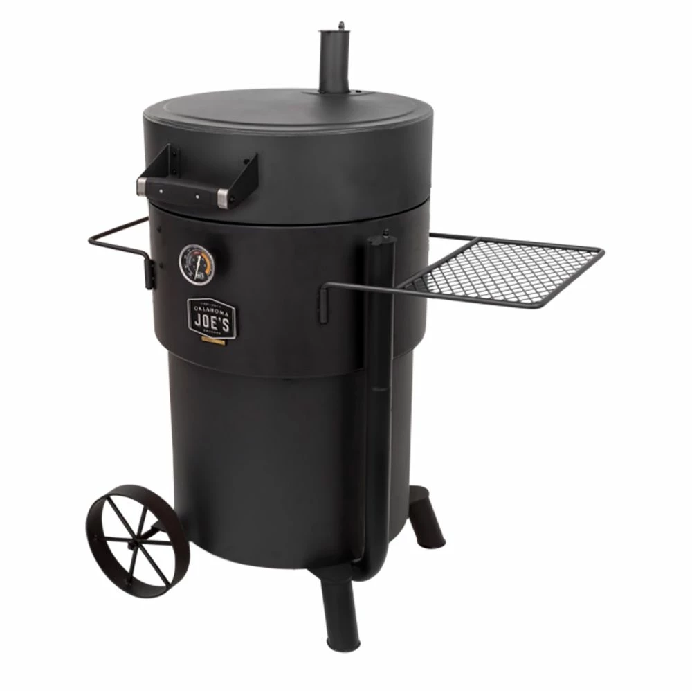 Oklahoma Joe’s OKJ-19202 Anthem Series Bronco Pro Drum Smoker provides a premium smoker to meet the needs of the most demanding pitmasters. Heavy-gauge steel construction ensures impressive durability for many years of delicious meals. A large cooking surface and 17-pound fuel capacity offer ample smoking potential, while a precision airflow system offers a greater level of temperature control. Variable cooking grate, meat hanger, and meat hook configurations offer customizable smoking options, a hinged lid with a gasket forms a tight seal for heat retention. A large ash pan with porcelain-coated components and a drain cap allows for easy cleanup–even at BBQ competitions! Additional features include a rubber handle that stays cool to the touch, a barrel-mounted quality temperature gauge, and large wheels for easy manueverability.