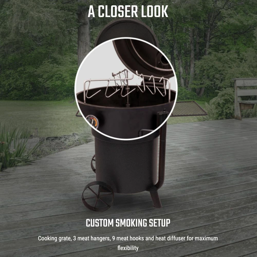 - Flexible – Cooking grate, meat hangers, meat hooks, and heat diffuser offer added versatility