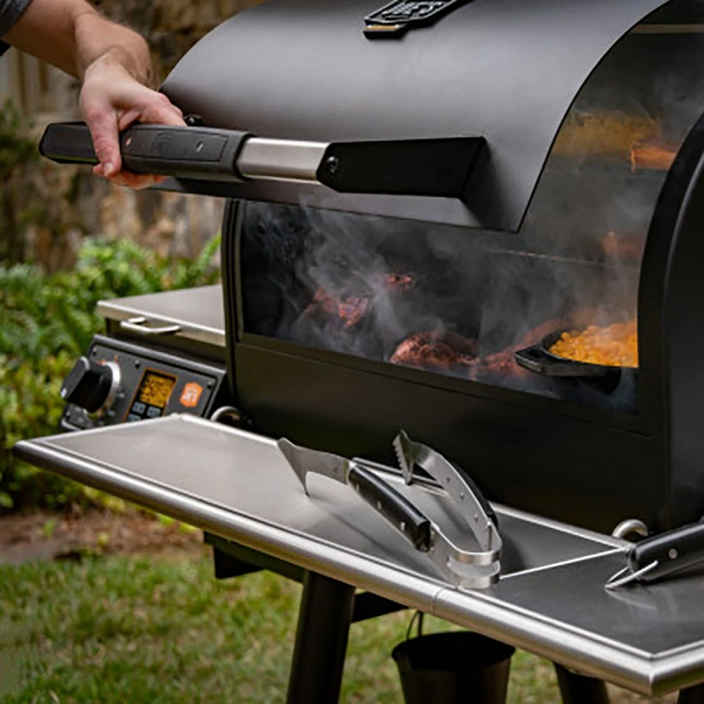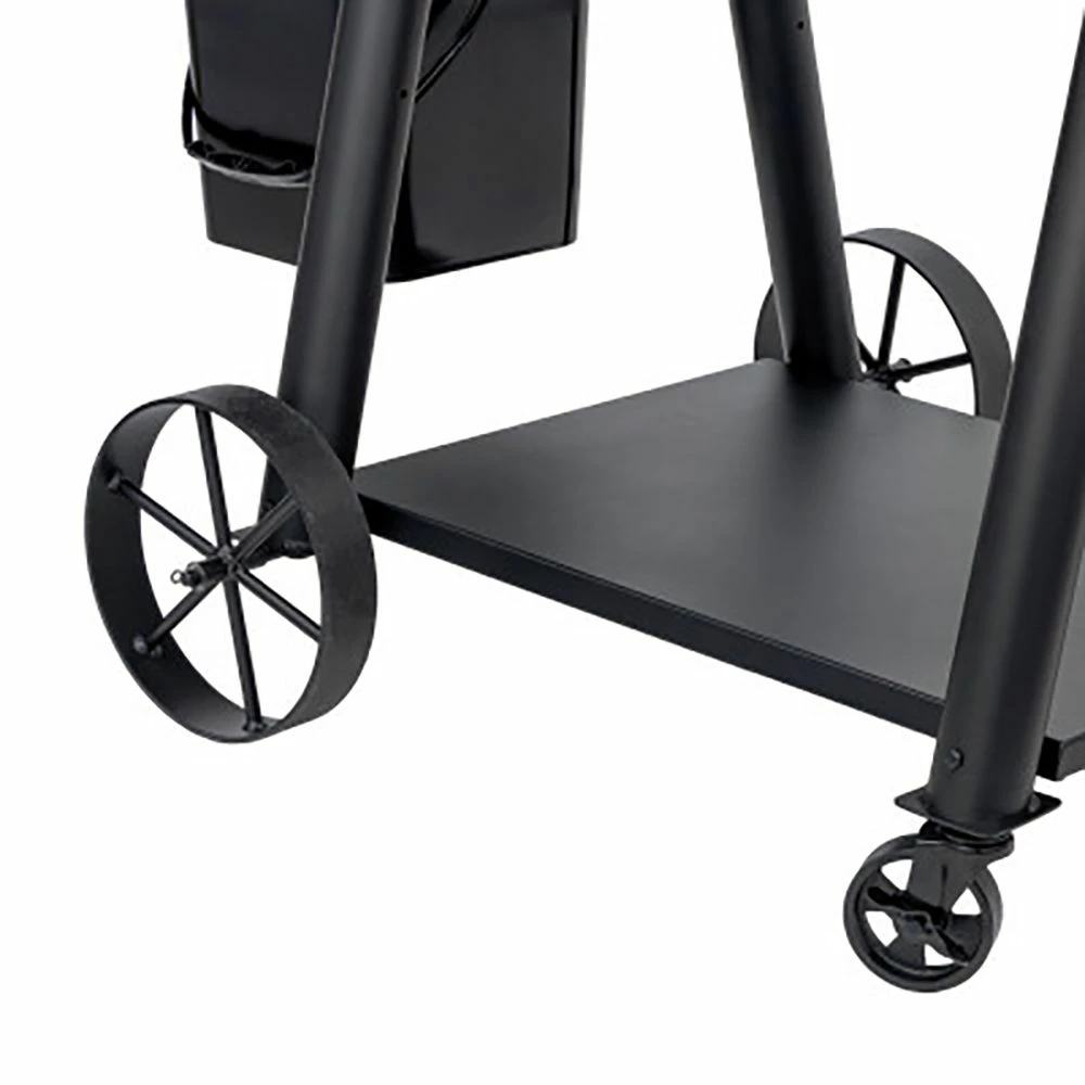 Fueled by all-natural wood pellets, this grill offers classic, rich, smoky flavors, while the QuickDraw Hopper features a 20-pound capacity and a simple design. Additional features include a removable ash cup for easy cleanup, an easy-to-grip rubber handle, and wagon-style wheels and casters for easy movement.