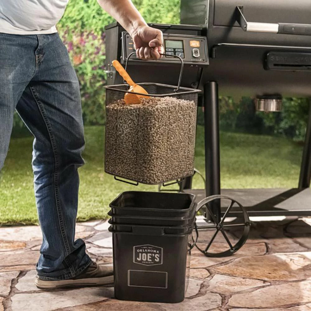 Oklahoma Joe’s OKJ-5159038R04 4-Piece Pellet Bucket Kit provides a convenient tool kit to use with your pellet grill. This kit includes a plastic pellet bucket with 20 pounds of hardwood pellet storage and an airtight lid. The included wire-mesh filter sifts out wood dust, while the included scoop allows for easy loading of pellets into the grill’s hopper.