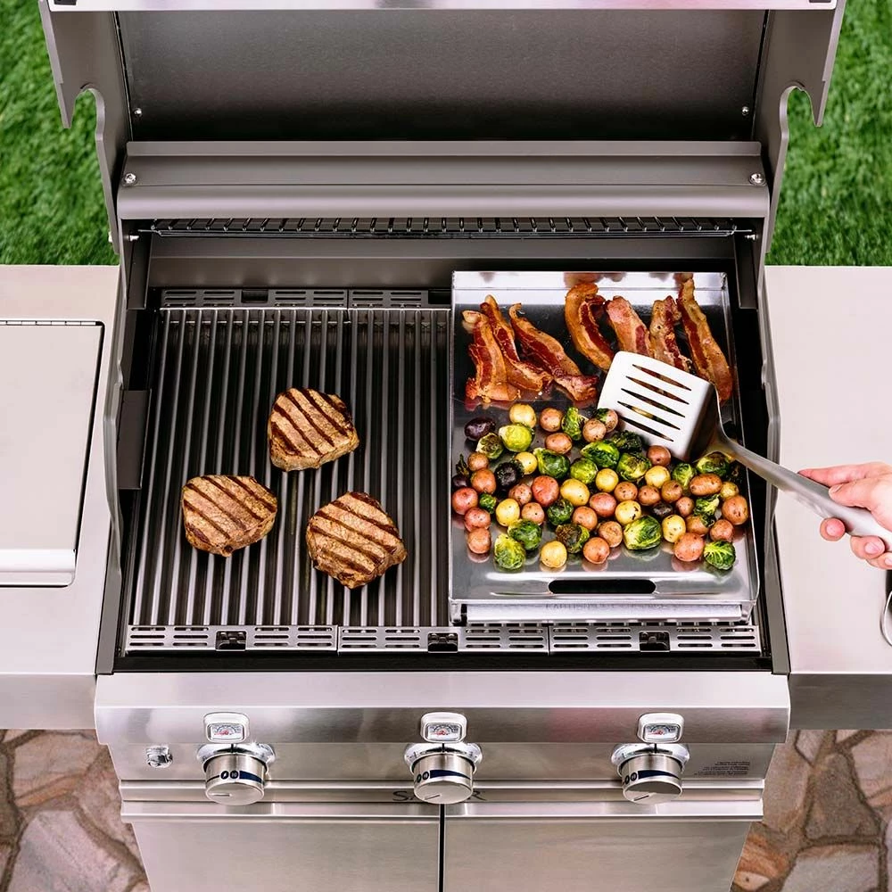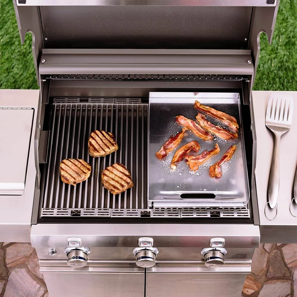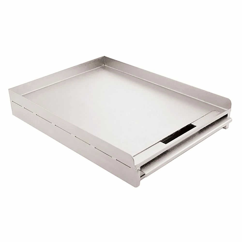 Saber A00AA1313 EZ Stainless Steel Griddle provides a premium accessory for use with your grill. This stainless steel griddle basket offers a durable design to stand up to the rigors of frequent use. Cook everything from burgers to Brussels sprouts with this restaurant-style griddle. A removable drip tray keeps grease and food debris out of the way of cooking and offers easy cleanup. Place the griddle directly on the grates and ignite your burners to heat the accessory and increase your cooking options.