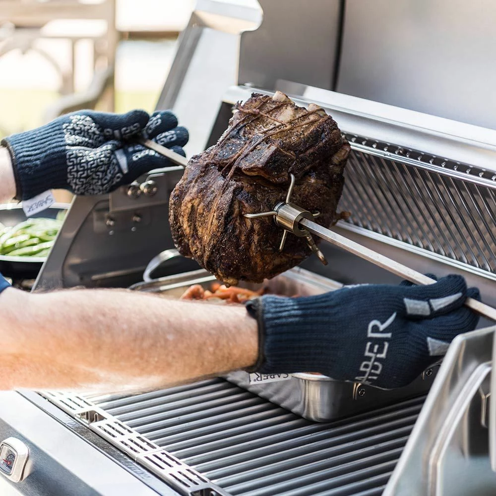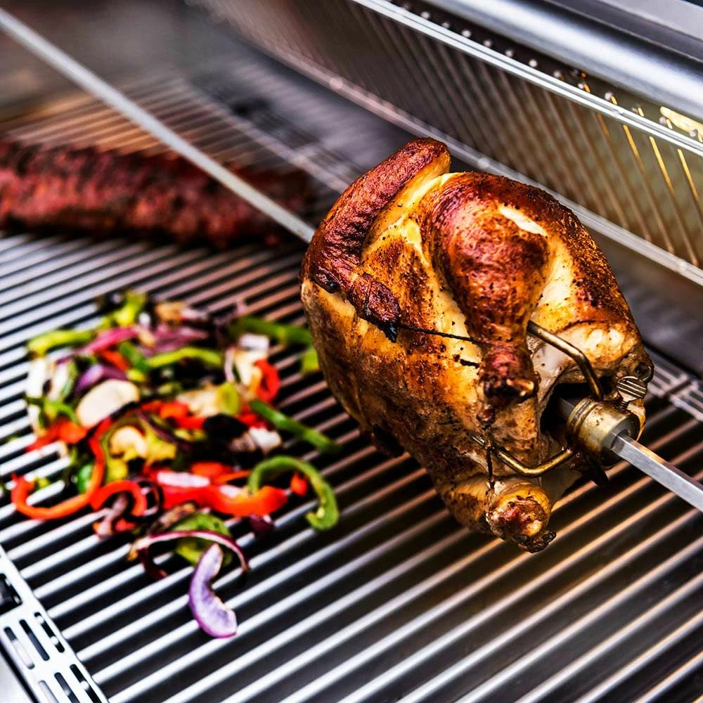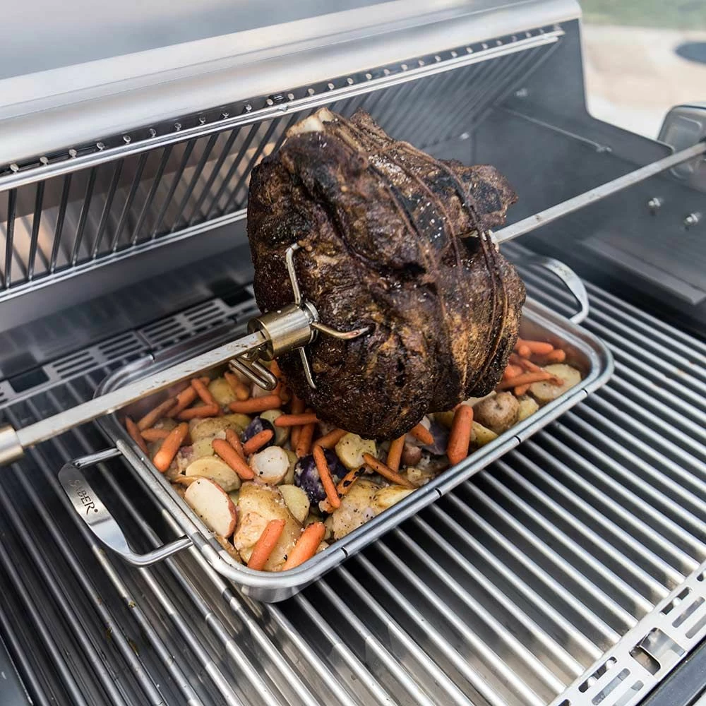 Saber A50AA0212 Stainless Steel Rotisserie Rod for 3-Burner Grill provides a premium accessory for use with your grill. Featuring durable 304 stainless steel construction, this rotisserie rod has been built for many years of great barbecue. The Saber 3-Burner Rotisserie Spit Rod fits Saber 3-Burner Gas Grills and does not interfere with either side shelf area. Set up a rotisserie to cook whole chickens, turkey or roasts.