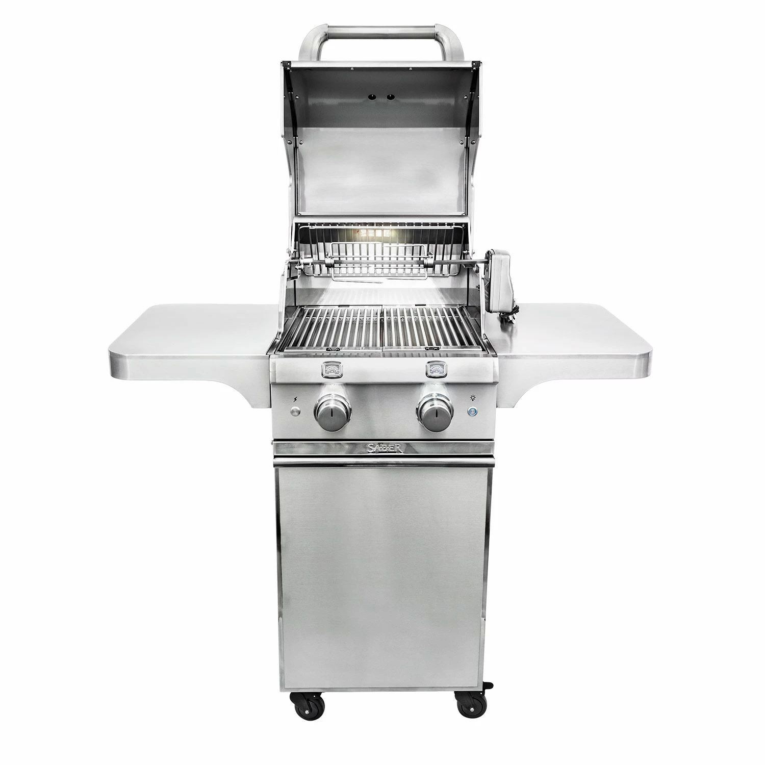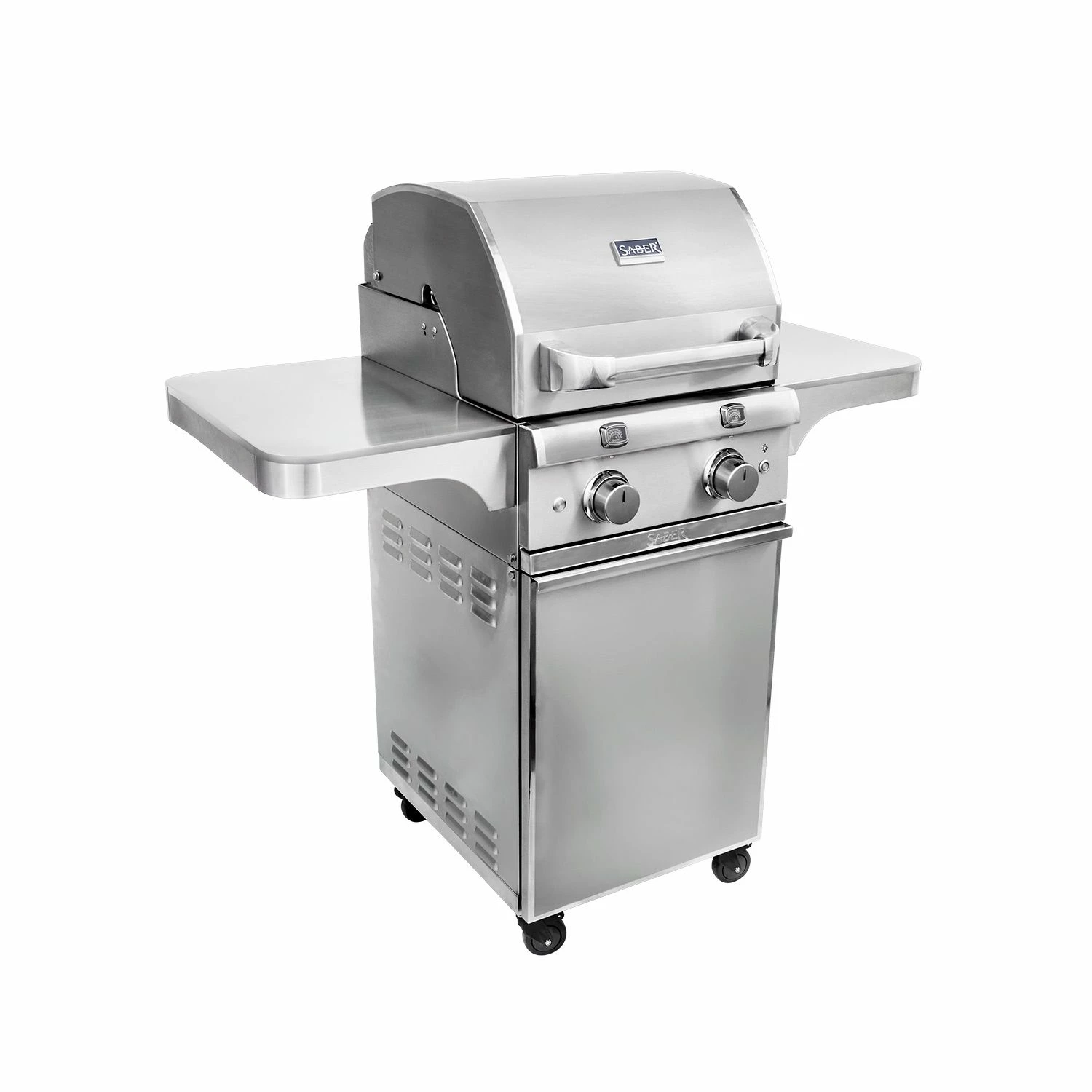 Saber R33SC0717 2-Burner Elite Freestanding Infrared Grill with Rotisserie, 20-Inches provides a premium addition to your outdoor kitchen. This grill brings restaurant quality results to your home with its patented Saber Cooking System. This innovative burner design heats evenly, eliminates flare-ups, and uses up to 30 percent less gas than comparable burners. This grill also offers a wider temperature range than traditional grills–from high temperature searing to low and slow roasting and everything in between. The Saber infrared can also pre-heat to searing temperatures in only 12 minutes to reduce the time it takes to get your food from grill to plate. When you’re finished grilling, the easy-to-clean design of the Saber grill allows food drippings to be burned off and brushed away with ease to save you even more time.