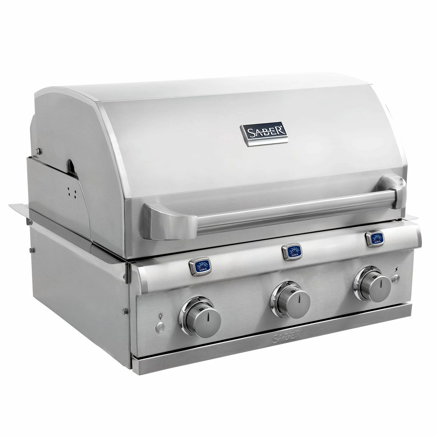 Saber R50SB1517 3-Burner Elite Built-In Infrared Grill with Rotisserie, 32-Inches provides a premium addition to your outdoor kitchen. This grill brings restaurant quality results to your home with its patented Saber Cooking System. This innovative burner design heats evenly, eliminates flare-ups, and uses up to 30 percent less gas than comparable burners. This grill also offers a wider temperature range than traditional grills–from high temperature searing to low and slow roasting and everything in between. The Saber infrared can also pre-heat to searing temperatures in only 12 minutes to reduce the time it takes to get your food from grill to plate. When you’re finished grilling, the easy-to-clean design of the Saber grill allows food drippings to be burned off and brushed away with ease to save you even more time.