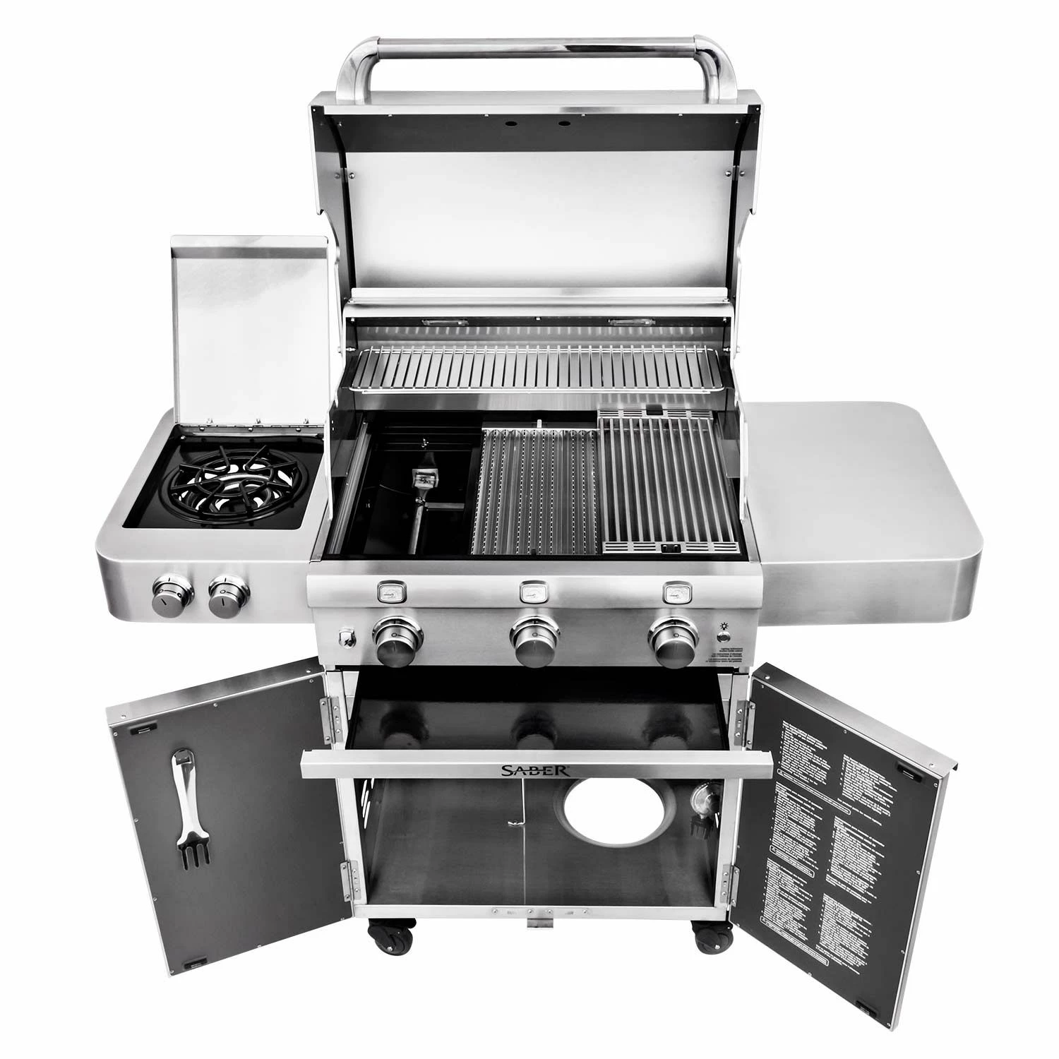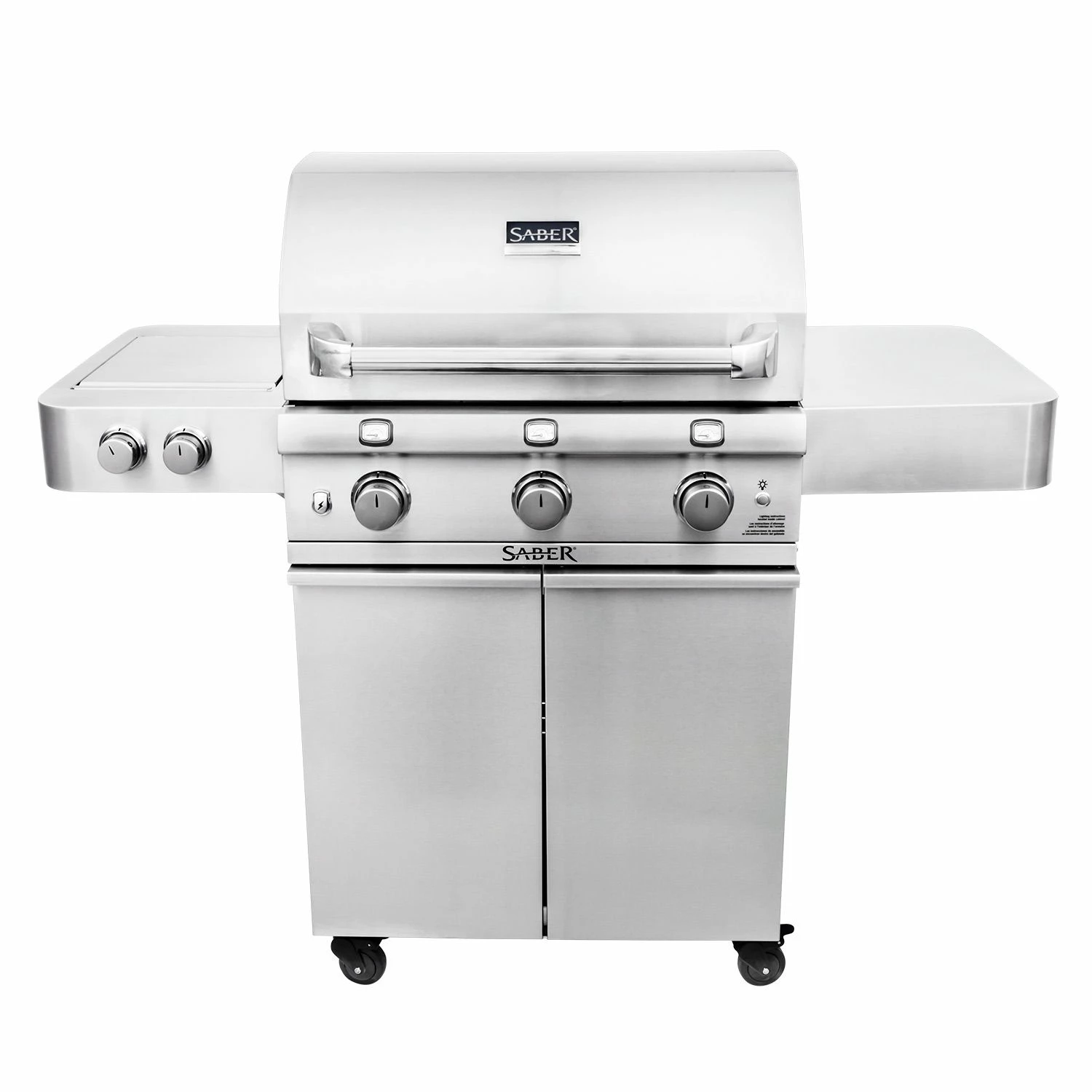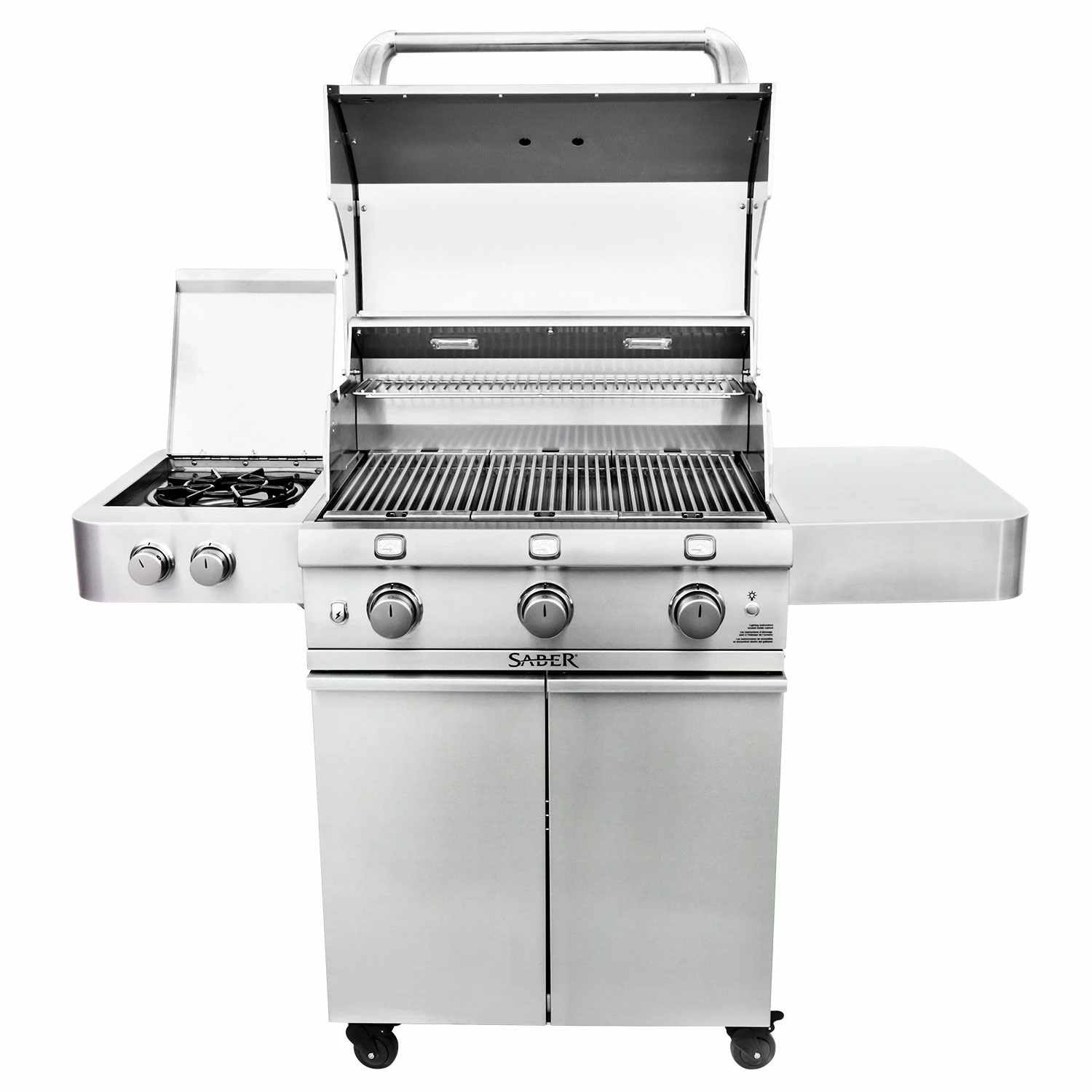 Saber R50SC0017 3-Burner Deluxe Freestanding Infrared Grill with Side Burner, 32-Inches provides a premium addition to your outdoor kitchen. This grill brings restaurant quality results to your home with its patented Saber Cooking System. This innovative burner design heats evenly, eliminates flare-ups, and uses up to 30 percent less gas than comparable burners. This grill also offers a wider temperature range than traditional grills–from high temperature searing to low and slow roasting and everything in between. The Saber infrared can also pre-heat to searing temperatures in only 12 minutes to reduce the time it takes to get your food from grill to plate. When you’re finished grilling, the easy-to-clean design of the Saber grill allows food drippings to be burned off and brushed away with ease to save you even more time.