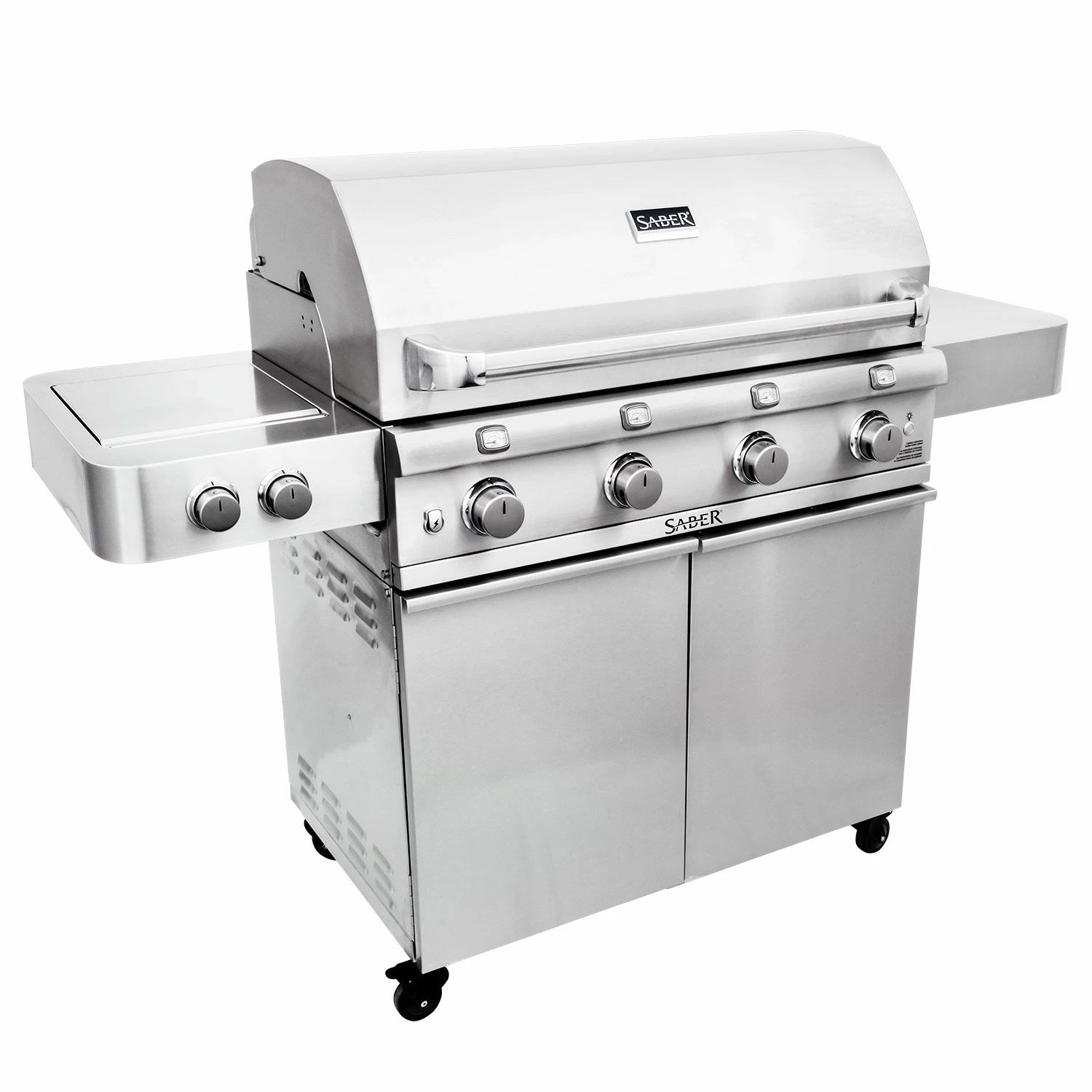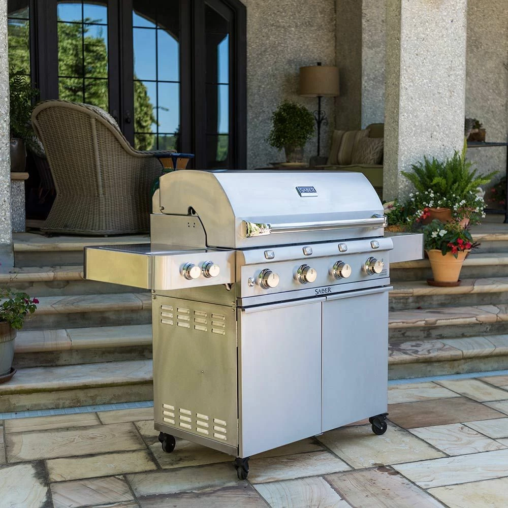 Saber R67SC0017 4-Burner Deluxe Freestanding Infrared Grill with Side Burner, 40-Inches provides a premium addition to your outdoor kitchen. This grill brings restaurant quality results to your home with its patented Saber Cooking System. This innovative burner design heats evenly, eliminates flare-ups, and uses up to 30 percent less gas than comparable burners. This grill also offers a wider temperature range than traditional grills–from high temperature searing to low and slow roasting and everything in between. The Saber infrared can also pre-heat to searing temperatures in only 12 minutes to reduce the time it takes to get your food from grill to plate. When you’re finished grilling, the easy-to-clean design of the Saber grill allows food drippings to be burned off and brushed away with ease to save you even more time.