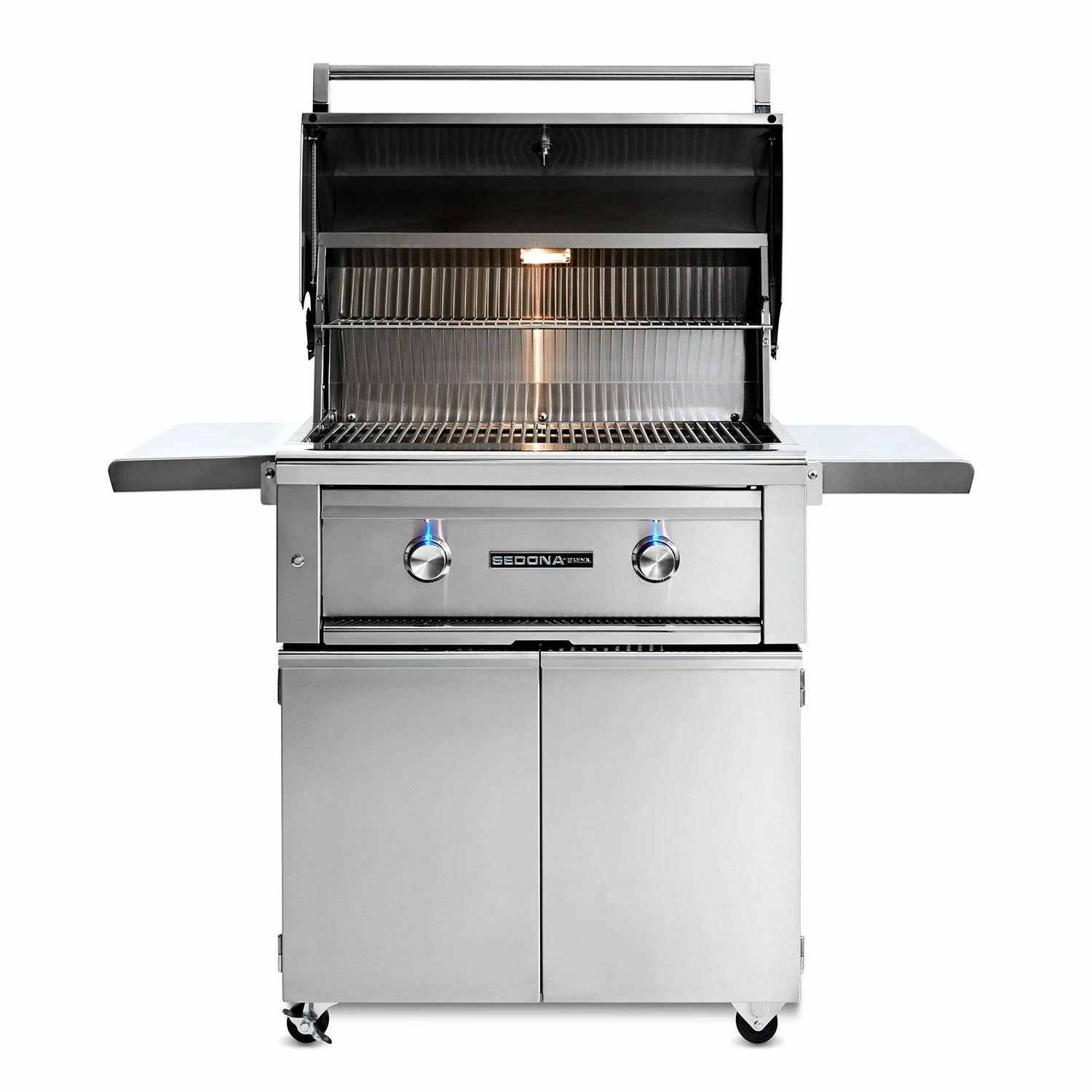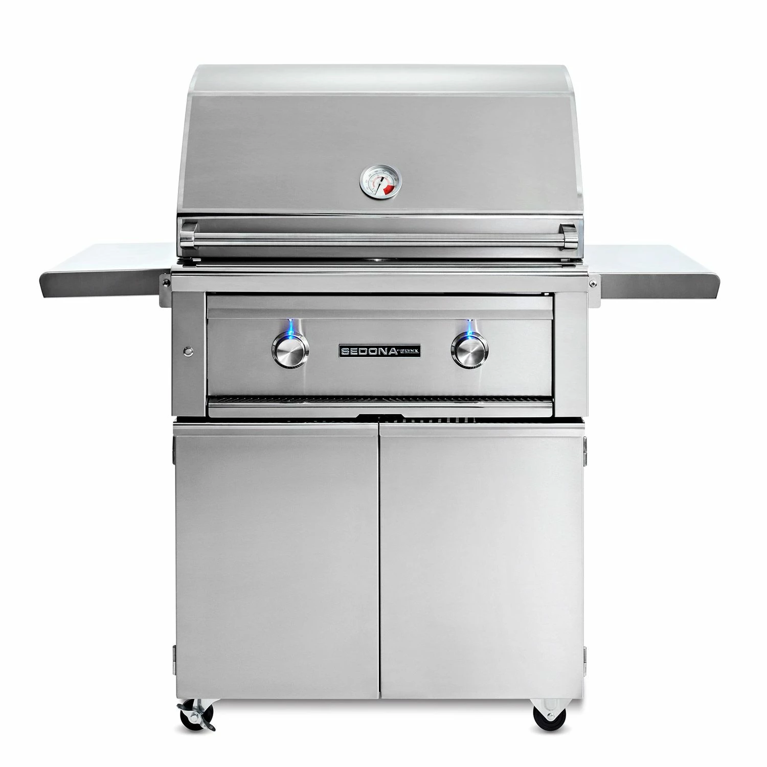 Sedona By Lynx L500F 30-Inch Gas Grill On Cart provides a superior blend of innovative features and professional craftsmanship to create one of the most advanced grills on the market. This BBQ grill features a heavy 201 stainless steel construction with smooth welded joints and polished mirrored edges for a blend of style and durability that will stand up to the elements in any climate. Designed for professional-style performance, the grill features heavy duty stainless steel tube burners to provide extreme high heat across the grilling surface. The traditional tube burners sit below a rack of ceramic radiant briquettes to provide a charcoal-like infrared heat for an enhanced gas grilling experience that’s evenly distributed across the grill surface. With LED backlit control knobs, internal halogen grill lights, an optional rotisserie system with infrared rear burner, and a spark ignition, this unit combines all of the requisite features of a high-end grill and then some – so you can create the best barbecue.
