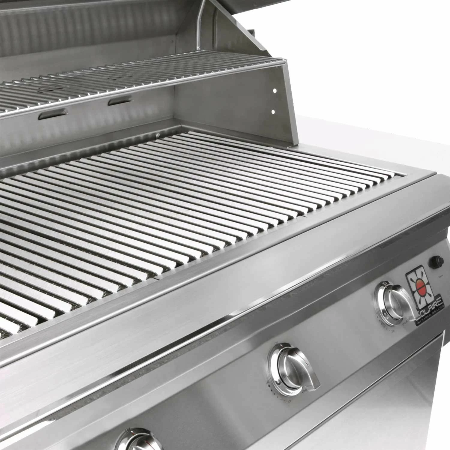 All Solaire grills offer an impressive collection of standard features to stand out from the competition. These grills offer infrared burners with ceramic plates and stainless steel construction for commercial quality cooking potential, while stainless steel V-grilling grates enhance flavor and reduce flare-ups. These impressive appliances offer 304 stainless steel construction with welded seams and no mechanical fasteners to ensure long-term durability, while hand-polished, mirror-finished accents and metal knobs offer an impressive appearance in any setting. A double skin hood with a stay-cool, stainless steel knurled handle offers added safety, while a removable stainless steel warming rack and drip tray offer added versatility and convenience. With their top-supported, self-trimming design, these grills offer easy built-in installation. This grill head can also be removed from its freestanding grill base and built into a grill island if your needs change.