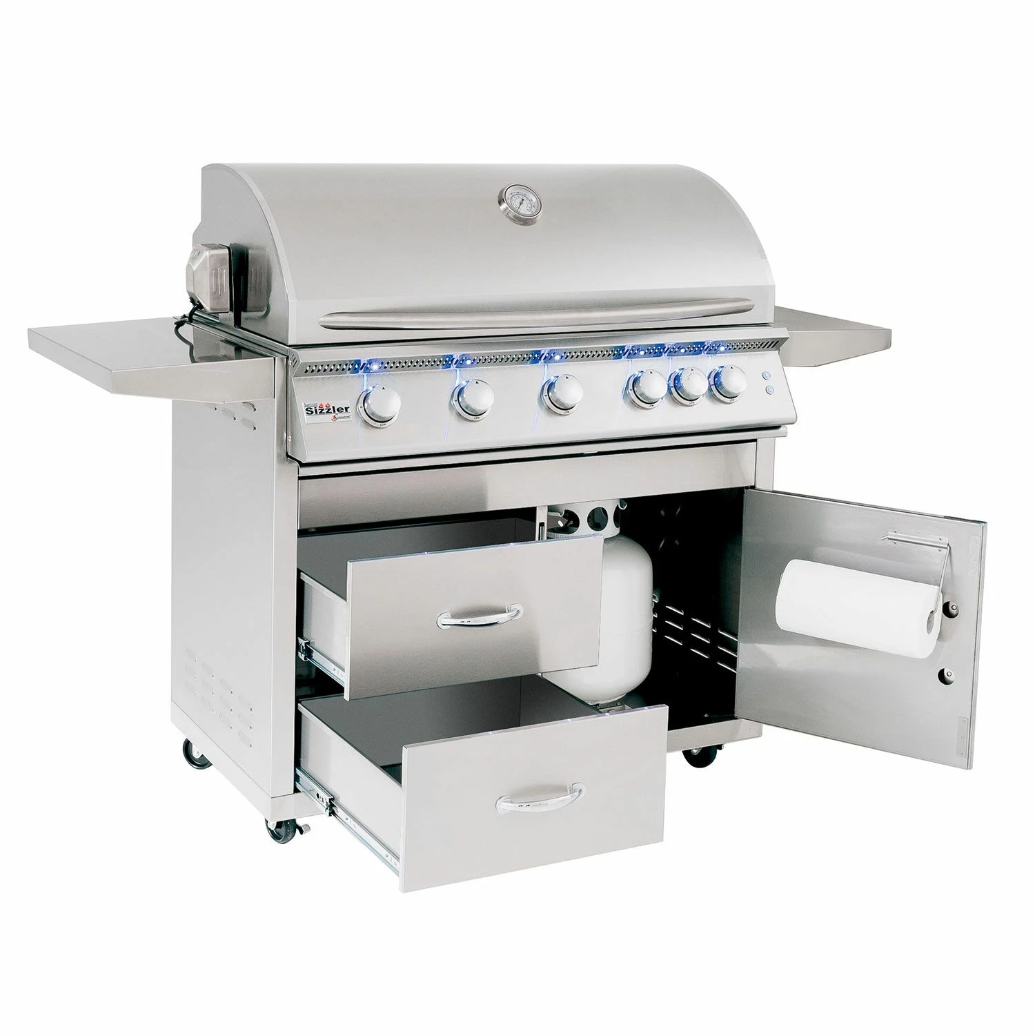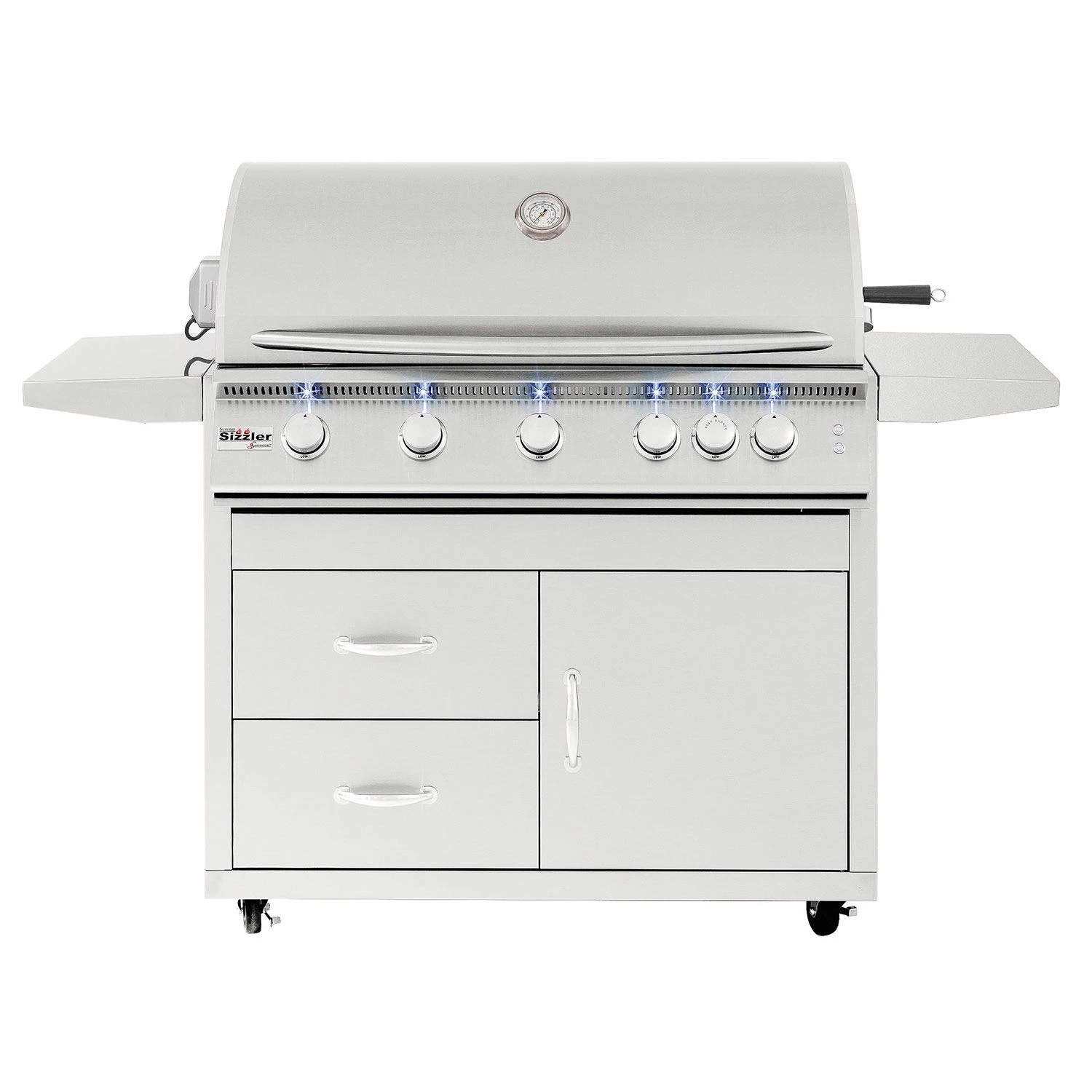 The 40-inch Sizzler also features a unique Flame Thrower Ignition that shoots a burst of flame to ignite the main burners and is much more reliable than traditional spark ignition systems. The insulated and double lined hood keeps hot air in to ensure a consistent grilling environment complete with a built in 3-inch temperature gauge, (2) interior lights, and enhancing LED lights. In addition, the 15,000 BTU infrared back burner offers a high quality rotisserie burner for professional style rotisserie cooking. The stainless steel grill cart features double door storage, fixed shelves, and high quality locking casters to provide a terrific stand alone grill option.
