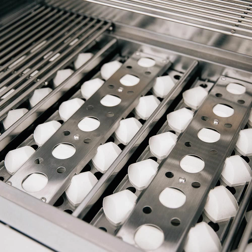 - Captured Briquette Trays – Unique ceramic briquettes sit above the burner to provide radiant heat and eliminate hot/cold zones across the 875in² cooking surface