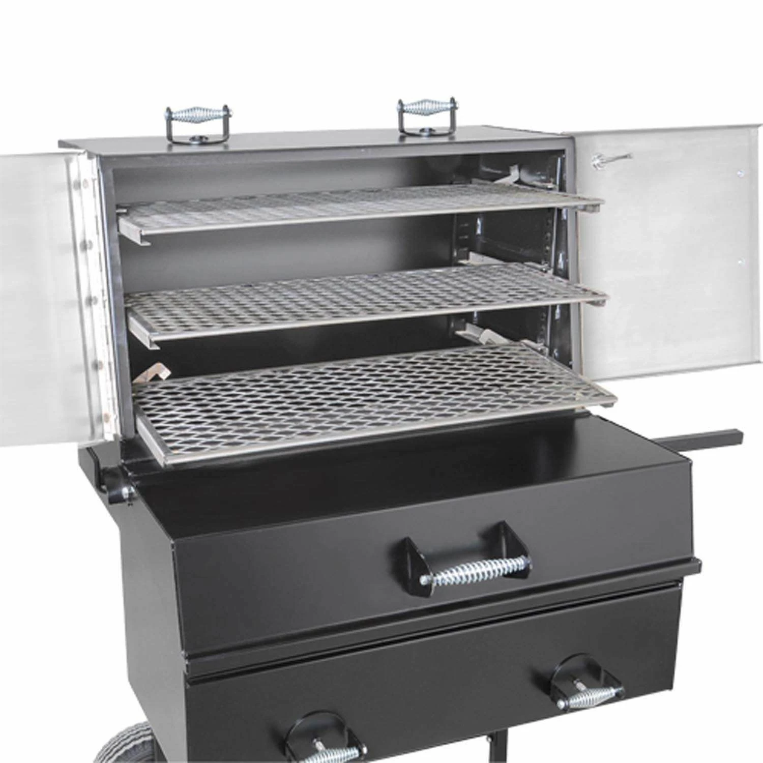 - Smoking Shelves – (3) Adjustable, locking smoking shelves allow for large amounts of food to be smoked at one time