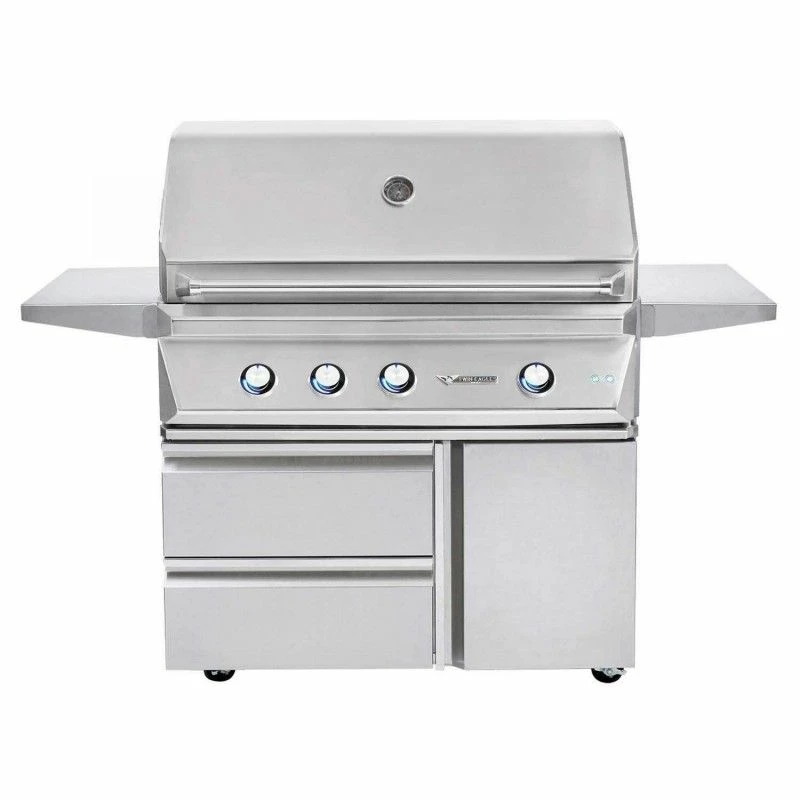 Twin Eagles TEBQ42-C 42-Inch Gas Grill On Cart With Drawers And Door provides a high end grill with unmatched luxury and design. The premium 304 stainless steel construction ensures a long lasting and quality product, while the high attention to detail presents a well crafted grill that’s as sleek as it is durable. The 760-square-inch grilling surface features (3) heavy duty grill burners that provide a total heat output of 75,000 BTU. The beautiful grill base matches the grill head and accessories and features (1) soft closing door, (2) self-latching drawers, heavy duty casters with front breaks, and fold down side shelves with tool holders. With optional additions, such as the infrared sear zone and infrared rotisserie, this grill exemplifies the ultimate combination of form and function–a true high performance BBQ grill.