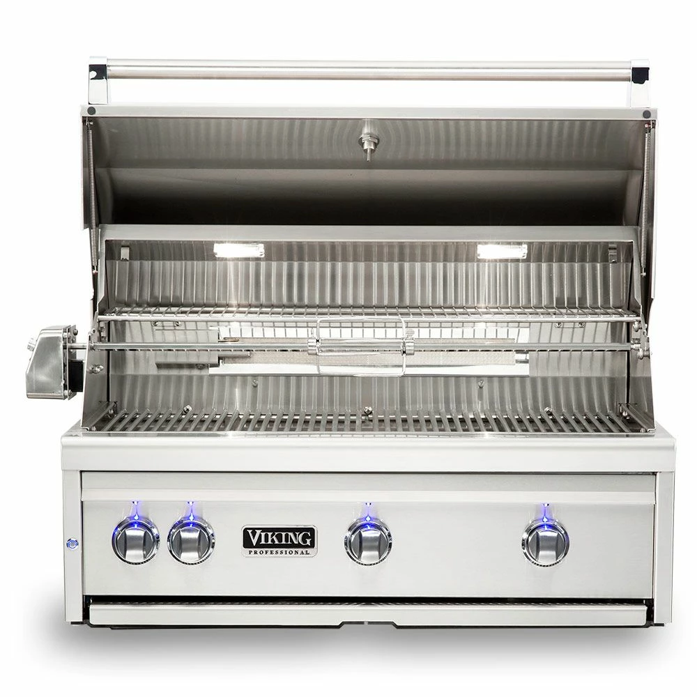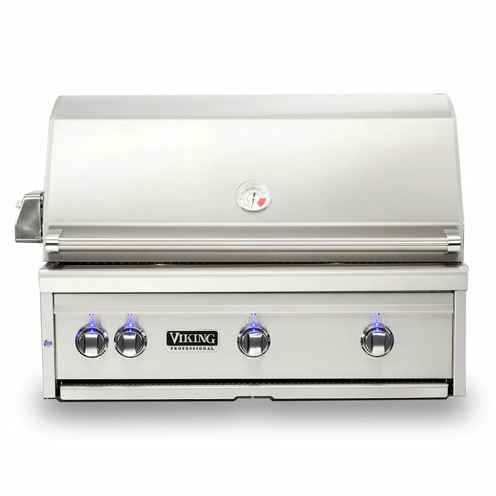 Viking 5 Series Stainless Steel Built-In Gas Grill with ProSear Burner & Rotisserie, 36-Inch (VQGI536) offers a top-of-the-line experience for the grill master who is serious about performance and quality, built from 16-gauge stainless steel to last through the years. It features (2) commercial grade cast brass burners which put out 25,000 BTU each and an infrared ProSear burner for achieving excellent color and flavor every time. As if that weren’t enough, it also comes outfitted with a dedicated infrared rear burner and heavy-duty rotisserie kit with a 3-speed motor for even more versatility. Combine all of this with the high-density ceramic briquettes providing even and reliable radiant heat across the 935in² grilling surface and you’ve got a grill that produces delicious results that are sure to impress.