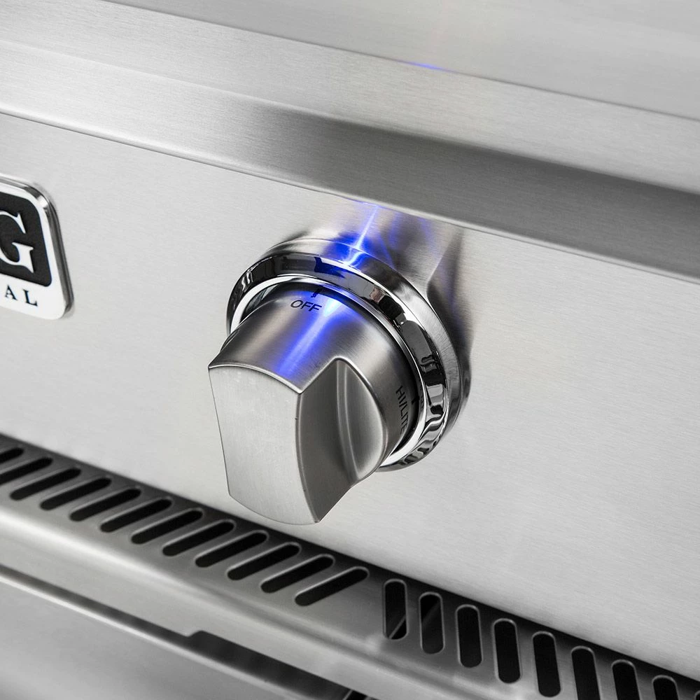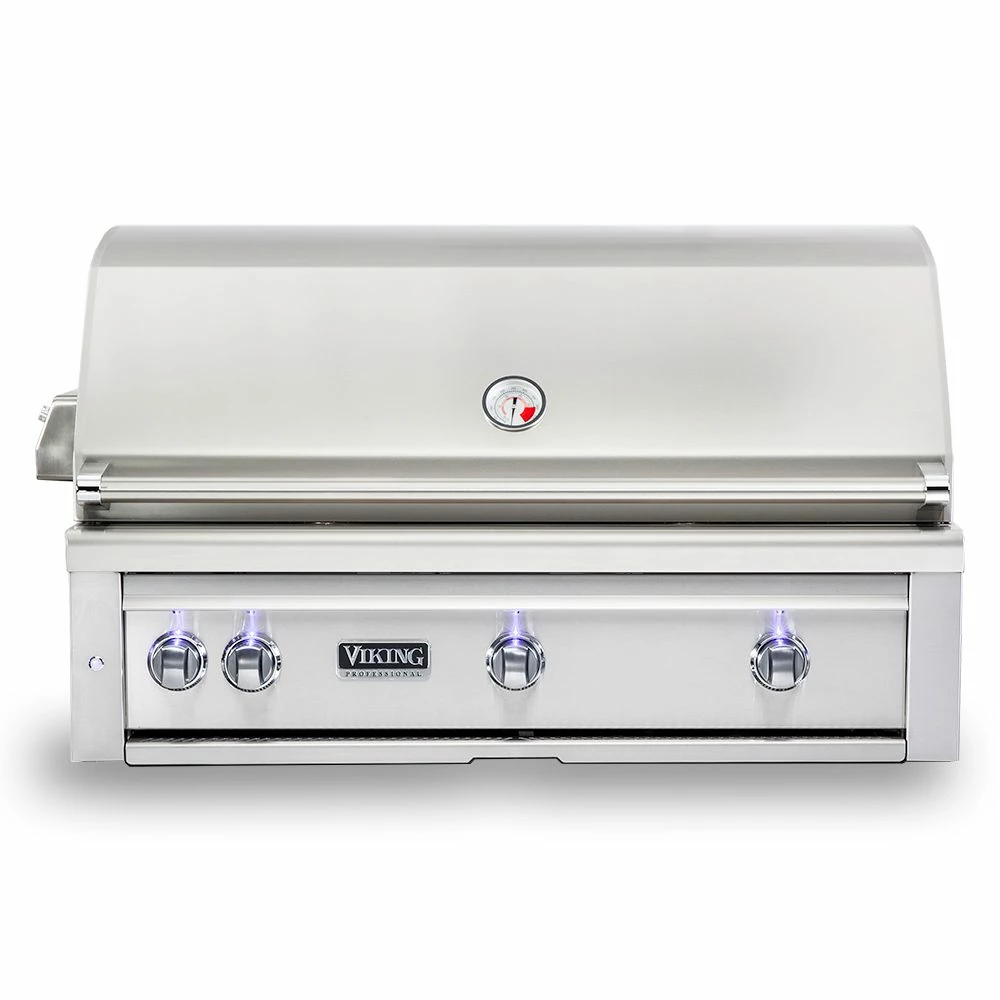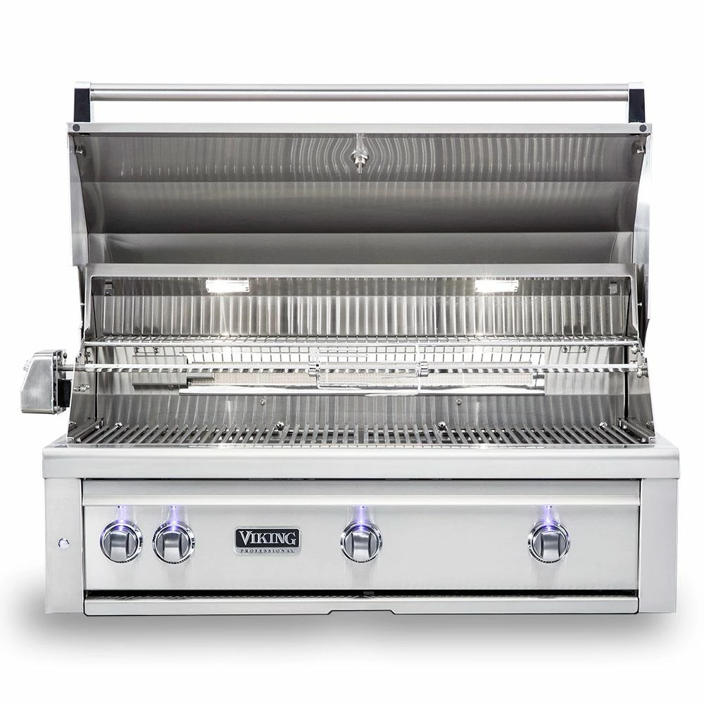 Viking 5 Series Stainless Steel Built-In Gas Grill with ProSear Burner & Rotisserie, 42-Inch (VQGI542) offers a top-of-the-line experience for the grill master who is serious about performance and quality, built from 16-gauge stainless steel to last through the years. It features (2) commercial grade cast brass burners which put out 25,000 BTU each and an infrared ProSear burner for achieving excellent color and flavor every time. As if that weren’t enough, it also comes outfitted with a dedicated infrared rear burner and heavy-duty rotisserie kit with a 3-speed motor for even more versatility. Combine all of this with the high-density ceramic briquettes providing even and reliable radiant heat across the 1200in² grilling surface and you’ve got a grill that produces delicious results that are sure to impress.