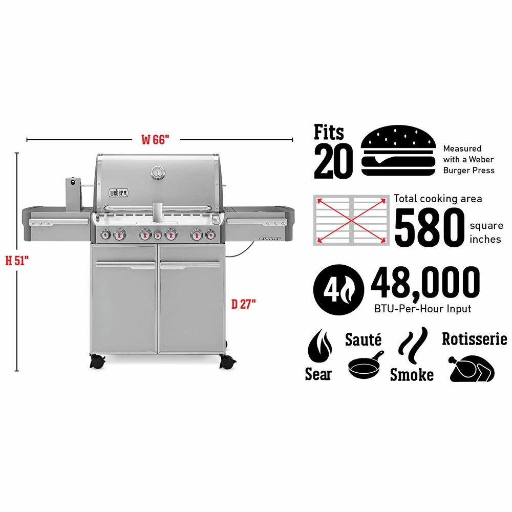 Weber Summit 4-Burner Freestanding Gas Grill with Rotisserie, Sear Station and Side Burner (WEB-E-S-470) provides a seriously impressive experience, offering features like an integrated rotisserie system, a smoker box with dedicated smoking burner and a high heat zone for searing meat. It also offers an exceptionally large cooking area, warming rack and a dual ring side burner to give you more space to work your magic. All Weber Freestanding Summit Series propane grills feature an LED fuel gauge to let you check your propane supply at a glance as well. Whether you’re looking to slow roast a whole chicken with the rotisserie, grill up a perfectly medium rare steak on the high heat sear zone or use the integrated smoker box to infuse some racks of ribs with delicious smoky flavor, the Weber Summit Series has what you need.